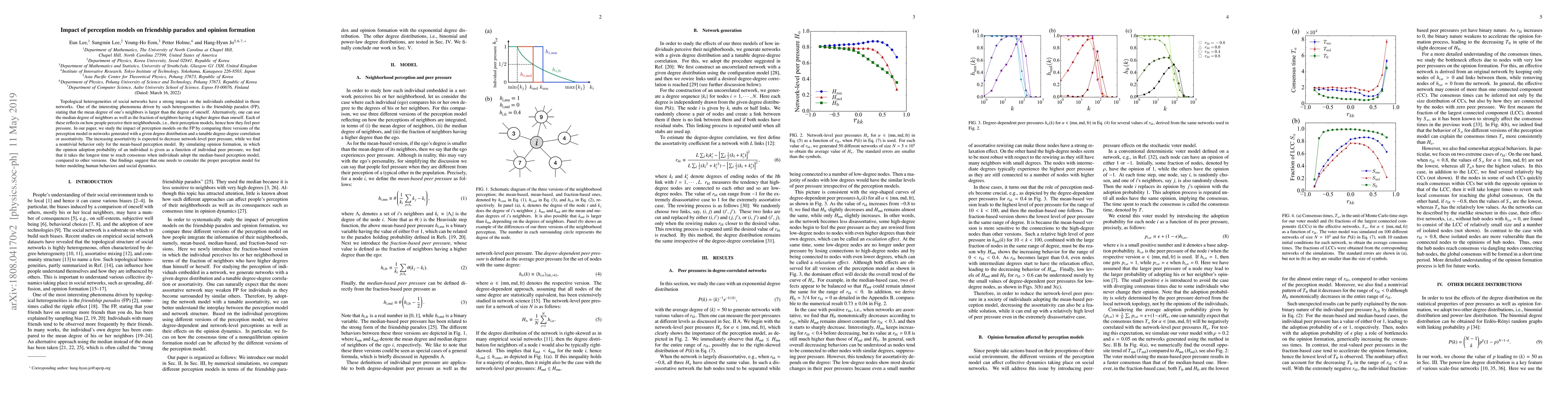Topological heterogeneities of social networks have a strong impact on the individuals embedded in those networks. One of the interesting phenomena driven by such heterogeneities is the friendship paradox (FP), stating that the mean degree of one's neighbors is larger than the degree of oneself. Alternatively, one can use the median degree of neighbors as well as the fraction of neighbors having a higher degree than oneself. Each of these reflects on how people perceive their neighborhoods, i.e., their perception models, hence how they feel peer pressure. In our paper, we study the impact of perception models on the FP by comparing three versions of the perception model in networks generated with a given degree distribution and a tunable degree-degree correlation or assortativity. The increasing assortativity is expected to decrease network-level peer pressure, while we find a nontrivial behavior only for the mean-based perception model. By simulating opinion formation, in which the opinion adoption probability of an individual is given as a function of individual peer pressure, we find that it takes the longest time to reach consensus when individuals adopt the median-based perception model, compared to other versions. Our findings suggest that one needs to consider the proper perception model for better modeling human behaviors and social dynamics.