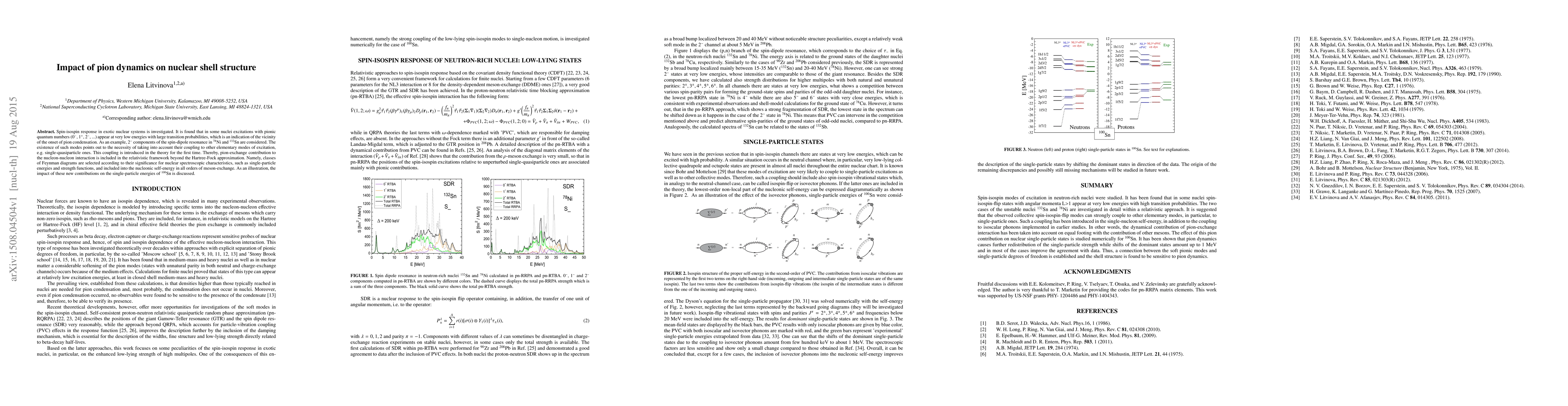 Spin-isospin response in exotic nuclear systems is investigated. It is found that in some nuclei excitations with pionic quantum numbers (0-, 1+, 2-, ...) appear at very low energies with large transition probabilities, which is an indication of the vicinity of the onset of pion condensation. As an example, 2- components of the spin-dipole resonance in 78-Ni and 132-Sn are considered. The existence of such modes points out to the necessity of taking into account their coupling to other elementary modes of excitation, e.g. single-quasiparticle ones. This coupling is introduced in the theory for the first time. Thereby, pion-exchange contribution to the nucleon-nucleon interaction is included in the relativistic framework beyond the Hartree-Fock approximation. Namely, classes of Feynman diagrams are selected according to their significance for nuclear spectroscopic characteristics, such as single-particle energies and strength functions, and included into the nucleonic self-energy in all orders of meson-exchange. As an illustration, the impact of these new contributions on the single-particle energies of 100-Sn is discussed.