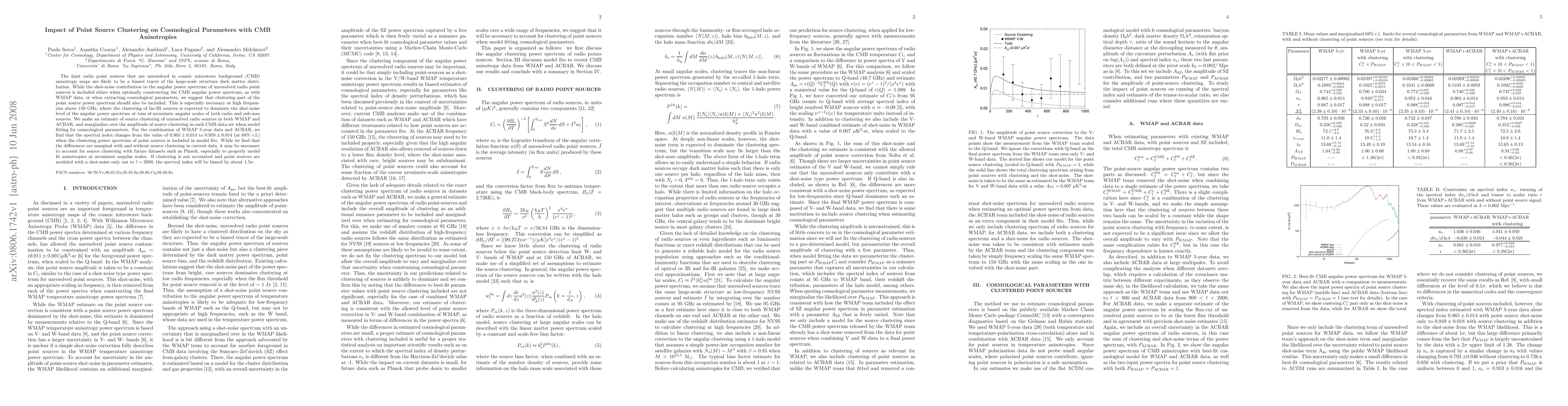This paper investigates the impact of clustering of unresolved radio point sources on cosmological parameters derived from CMB anisotropies. It finds that including clustering effects, especially at high frequencies, marginally alters the estimated spectral index, suggesting future datasets like Planck may require more accurate modeling of point source clustering.