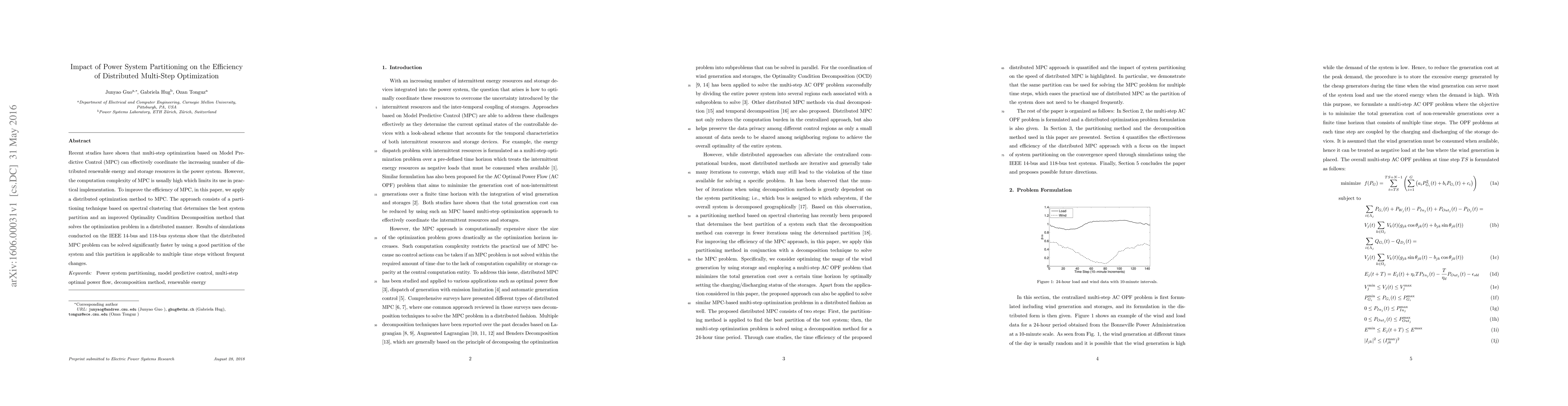 Recent studies have shown that multi-step optimization based on Model Predictive Control (MPC) can effectively coordinate the increasing number of distributed renewable energy and storage resources in the power system. However, the computation complexity of MPC is usually high which limits its use in practical implementation. To improve the efficiency of MPC, in this paper, we apply a distributed optimization method to MPC. The approach consists of a partitioning technique based on spectral clustering that determines the best system partition and an improved Optimality Condition Decomposition method that solves the optimization problem in a distributed manner. Results of simulations conducted on the IEEE 14-bus and 118-bus systems show that the distributed MPC problem can be solved significantly faster by using a good partition of the system and this partition is applicable to multiple time steps without frequent changes.