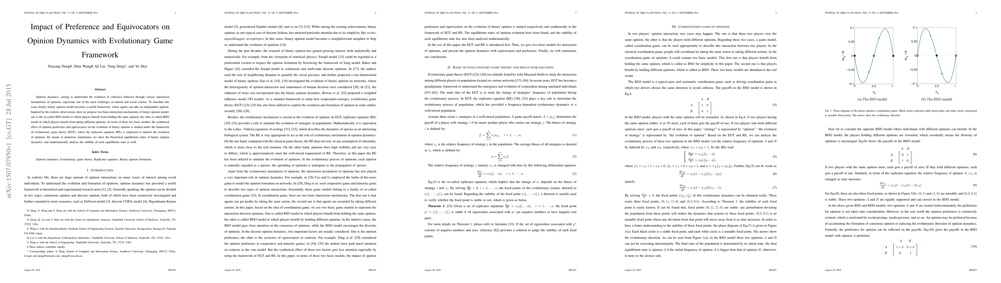 This paper explores opinion dynamics using binary opinion models, specifically the BSO and BDO frameworks, to understand how preference and equivocators influence collective behavior. It employs evolutionary game theory and the replicator equation to analyze the stability and equilibrium states of opinion evolution.