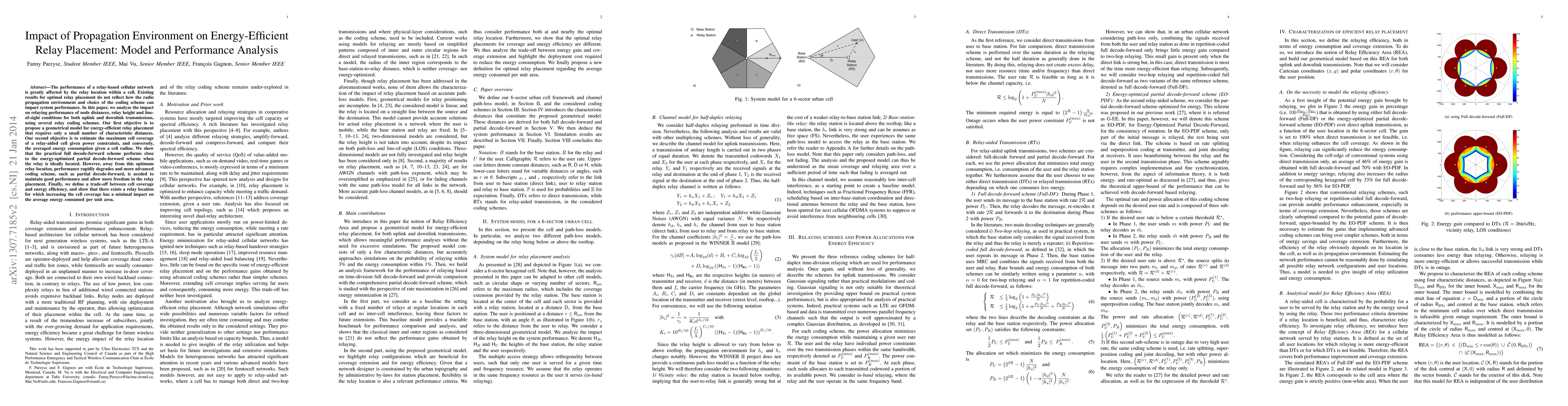 This paper proposes a geometrical model for energy-efficient relay placement in cellular networks, analyzing the impact of propagation environment factors on relay performance. It finds that while the full decode-forward scheme is nearly optimal when the relay is ideally located, more advanced schemes are needed for better performance and flexibility in relay placement, highlighting a trade-off between cell coverage and energy efficiency.