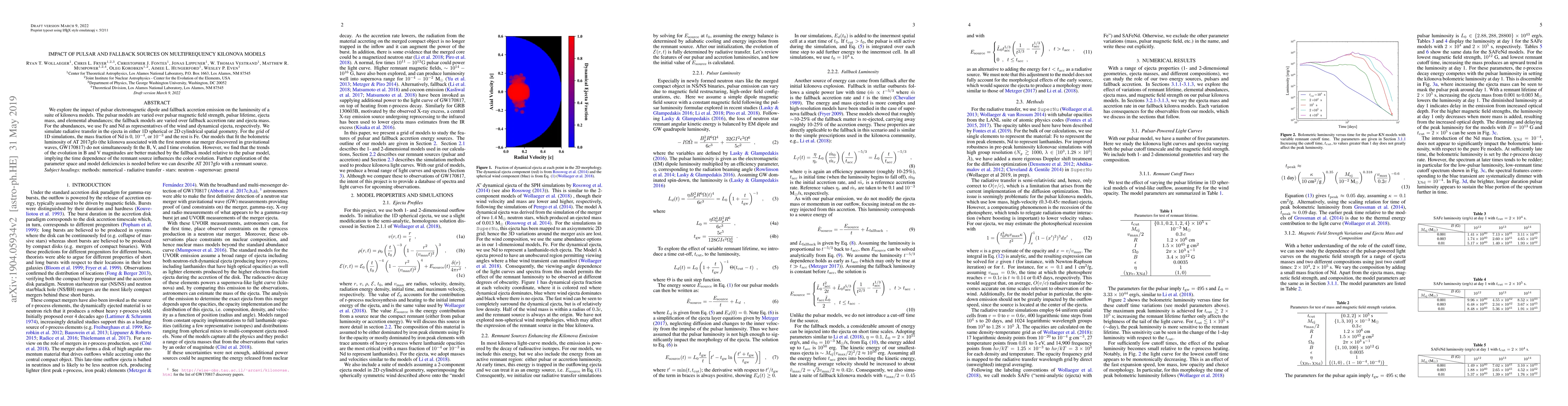 We explore the impact of pulsar electromagnetic dipole and fallback accretion emission on the luminosity of a suite of kilonova models. The pulsar models are varied over pulsar magnetic field strength, pulsar lifetime, ejecta mass, and elemental abundances; the fallback models are varied over fallback accretion rate and ejecta mass. For the abundances, we use Fe and Nd as representatives of the wind and dynamical ejecta, respectively. We simulate radiative transfer in the ejecta in either 1D spherical or 2D cylindrical spatial geometry. For the grid of 1D simulations, the mass fraction of Nd is 0, $10^{-4}$, or $10^{-3}$ and the rest is Fe. Our models that fit the bolometric luminosity of AT 2017gfo (the kilonova associated with the first neutron star merger discovered in gravitational waves, GW170817) do not simultaneously fit the B, V, and I time evolution. However, we find that the trends of the evolution in B and V magnitudes are better matched by the fallback model relative to the pulsar model, implying the time dependence of the remnant source influences the color evolution. Further exploration of the parameter space and model deficiencies is needed before we can describe AT 2017gfo with a remnant source.