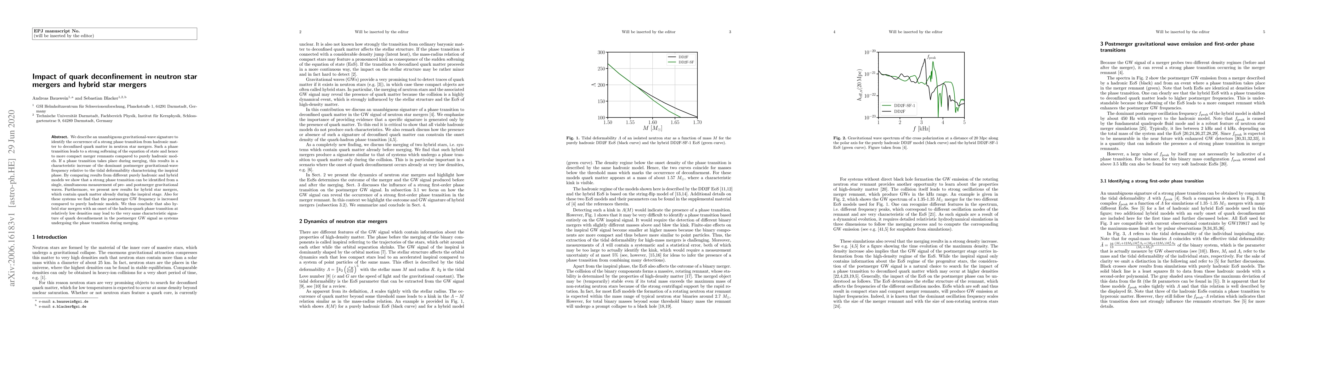 This research identifies a gravitational-wave signature indicative of quark deconfinement in neutron star and hybrid star mergers, demonstrating a significant softening of the equation of state. The study finds a distinct increase in postmerger gravitational-wave frequency compared to purely hadronic models, allowing for the detection of phase transitions through combined pre- and postmerger wave measurements.