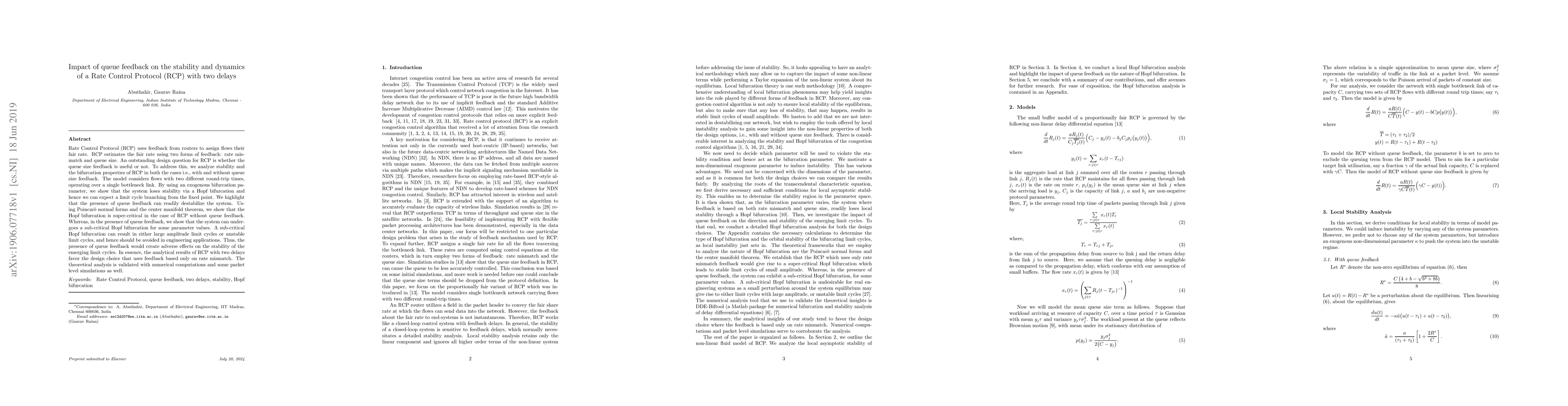 This paper investigates the impact of queue size feedback on the stability and dynamics of a Rate Control Protocol (RCP) with two delays, showing that queue feedback can destabilize the system via a sub-critical Hopf bifurcation, leading to potentially adverse effects on the stability of emerging limit cycles. The study favors a design using only rate mismatch feedback for stability.