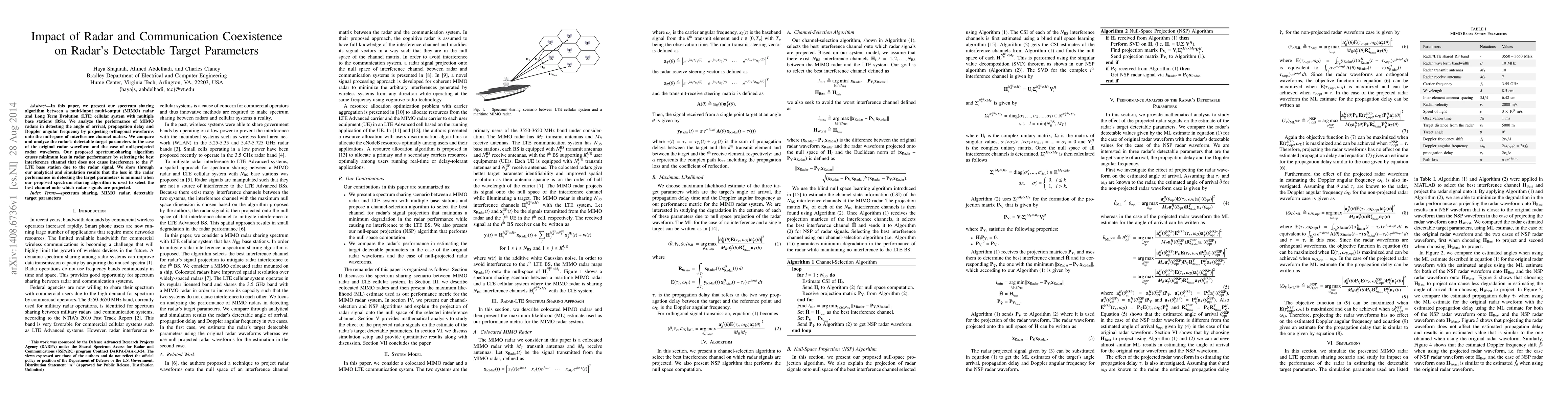 In this paper, we present our spectrum sharing algorithm between a multi-input multi-output (MIMO) radar and Long Term Evolution (LTE) cellular system with multiple base stations (BS)s. We analyze the performance of MIMO radars in detecting the angle of arrival, propagation delay and Doppler angular frequency by projecting orthogonal waveforms onto the null-space of interference channel matrix. We compare and analyze the radar's detectable target parameters in the case of the original radar waveform and the case of null-projected radar waveform. Our proposed spectrum-sharing algorithm causes minimum loss in radar performance by selecting the best interference channel that does not cause interference to the i'th LTE base station due to the radar signal. We show through our analytical and simulation results that the loss in the radar performance in detecting the target parameters is minimal when our proposed spectrum sharing algorithm is used to select the best channel onto which radar signals are projected.