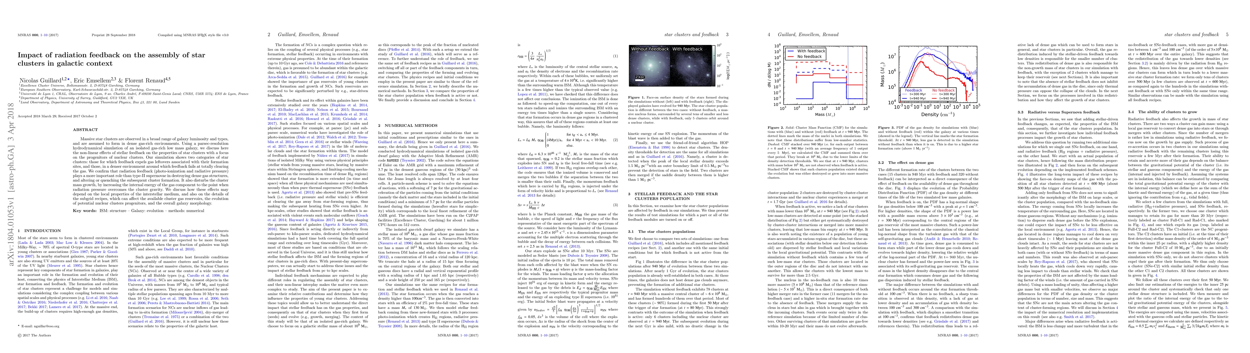 Massive star clusters are observed in a broad range of galaxy luminosity and types, and are assumed to form in dense gas-rich environments. Using a parsec-resolution hydrodynamical simulation of an isolated gas-rich low mass galaxy, we discuss here the non-linear effects of stellar feedback on the properties of star clusters with a focus on the progenitors of nuclear clusters. Our simulation shows two categories of star clusters: those for which feedback expels gas leftovers associated with their formation sites, and those, in a denser environment around which feedback fails at totally clearing the gas. We confirm that radiation feedback (photo-ionization and radiative pressure) plays a more important role than type-II supernovae in destroying dense gas structures, and altering or quenching the subsequent cluster formation. It also disturbs the cluster mass growth, by increasing the internal energy of the gas component to the point when radiation pressure overcomes the cluster gravity. We discuss how these effects may depend on the local properties of the interstellar medium, and also on the details of the subgrid recipes, which can affect the available cluster gas reservoirs, the evolution of potential nuclear clusters progenitors, and the overall galaxy morphology.