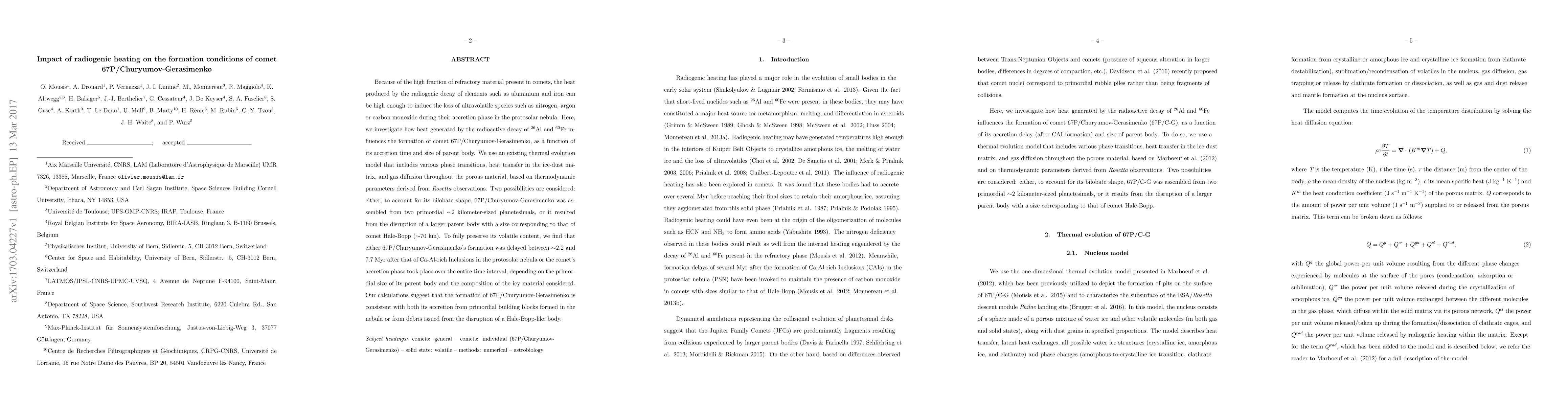 This study investigates how radiogenic heating from 26Al and 60Fe affects the formation of comet 67P/Churyumov-Gerasimenko, finding that its volatile content preservation depends on delayed accretion timing or prolonged formation phase. The results support both scenarios of its origin: from smaller planetesimals or debris from a larger disrupted body.