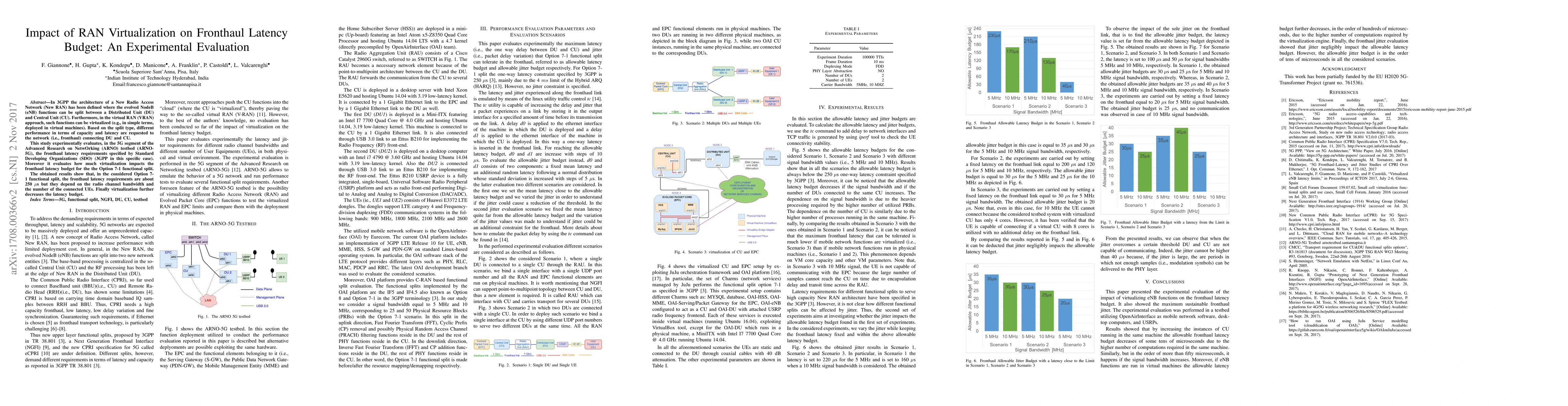 In 3GPP the architecture of a New Radio Access Network (New RAN) has been defined where the evolved NodeB (eNB) functions can be split between a Distributed Unit (DU) and Central Unit (CU). Furthermore, in the virtual RAN (VRAN) approach, such functions can be virtualized (e.g., in simple terms, deployed in virtual machines). Based on the split type, different performance in terms of capacity and latency are requested to the network (i.e., fronthaul) connecting DU and CU. This study experimentally evaluates, in the 5G segment of the Advanced Research on NetwOrking (ARNO) testbed (ARNO-5G), the fronthaul latency requirements specified by Standard Developing Organizations (SDO) (3GPP in this specific case). Moreover it evaluates how much virtualization impacts the fronthaul latency budget for the the Option 7-1 functional split. The obtained results show that, in the considered Option 7-1 functional split, the fronthaul latency requirements are about 250us but they depend on the radio channel bandwidth and the number of the connected UEs. Finally virtualization further decreases the latency budget.