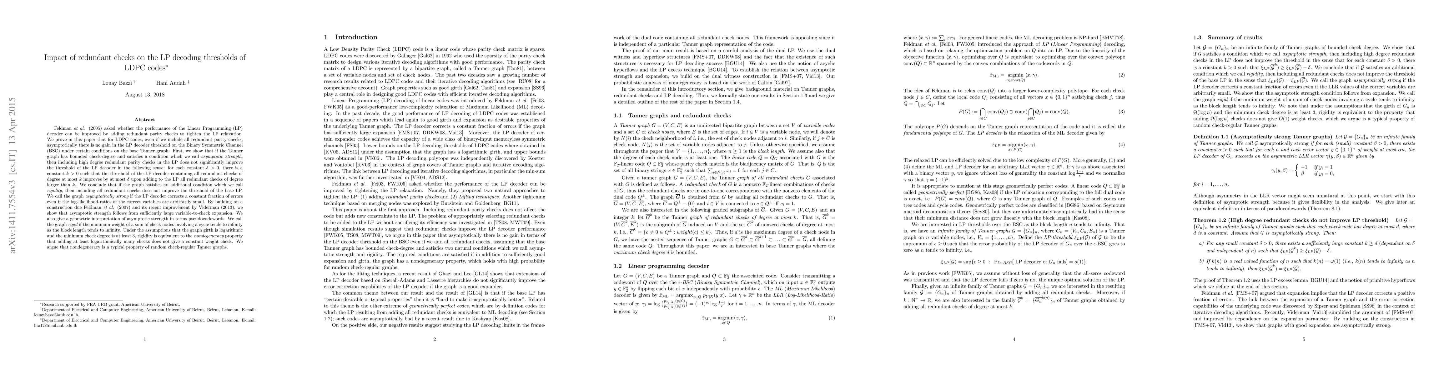 Feldman et al.(2005) asked whether the performance of the LP decoder can be improved by adding redundant parity checks to tighten the LP relaxation. We prove that for LDPC codes, even if we include all redundant checks, asymptotically there is no gain in the LP decoder threshold on the BSC under certain conditions on the base Tanner graph. First, we show that if the graph has bounded check-degree and satisfies a condition which we call asymptotic strength, then including high degree redundant checks in the LP does not significantly improve the threshold in the following sense: for each constant delta>0, there is a constant k>0 such that the threshold of the LP decoder containing all redundant checks of degree at most k improves by at most delta upon adding to the LP all redundant checks of degree larger than k. We conclude that if the graph satisfies a rigidity condition, then including all redundant checks does not improve the threshold of the base LP. We call the graph asymptotically strong if the LP decoder corrects a constant fraction of errors even if the LLRs of the correct variables are arbitrarily small. By building on the work of Feldman et al.(2007) and Viderman(2013), we show that asymptotic strength follows from sufficiently large expansion. We also give a geometric interpretation of asymptotic strength in terms pseudocodewords. We call the graph rigid if the minimum weight of a sum of check nodes involving a cycle tends to infinity as the block length tends to infinity. Under the assumptions that the graph girth is logarithmic and the minimum check degree is at least 3, rigidity is equivalent to the nondegeneracy property that adding at least logarithmically many checks does not give a constant weight check. We argue that nondegeneracy is a typical property of random check-regular graphs.