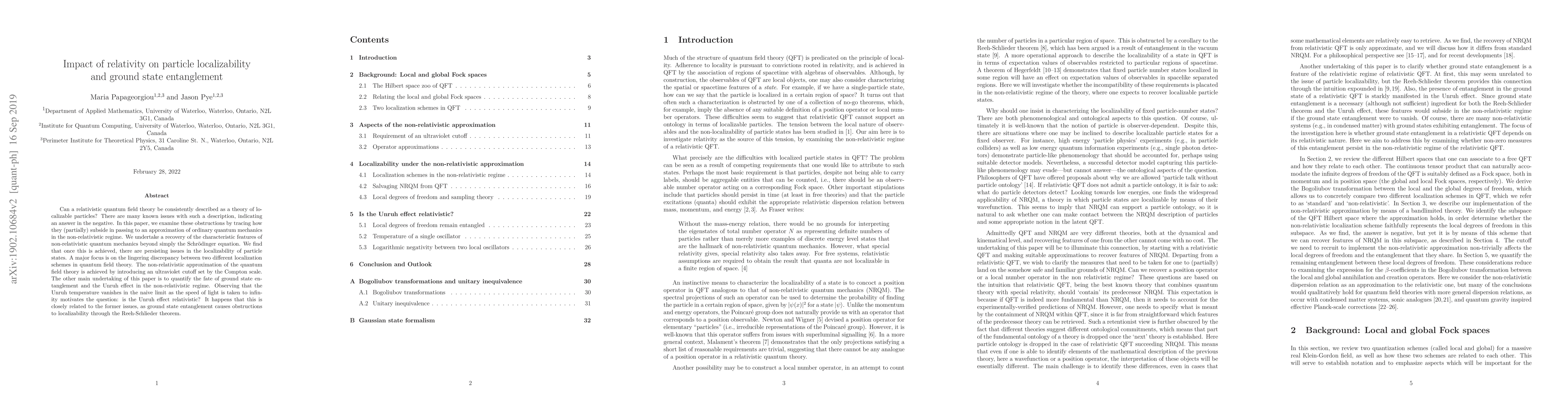 Can a relativistic quantum field theory be consistently described as a theory of localizable particles? There are many known issues with such a description, indicating an answer in the negative. In this paper, we examine these obstructions by tracing how they (partially) subside in passing to an approximation of ordinary quantum mechanics in the non-relativistic regime. We undertake a recovery of the characteristic features of non-relativistic quantum mechanics beyond simply the Schr\"odinger equation. We find that once this is achieved, there are persisting issues in the localizability of particle states. A major focus is on the lingering discrepancy between two different localization schemes in quantum field theory. The non-relativistic approximation of the quantum field theory is achieved by introducing an ultraviolet cutoff set by the Compton scale. The other main undertaking of this paper is to quantify the fate of ground state entanglement and the Unruh effect in the non-relativistic regime. Observing that the Unruh temperature vanishes in the naive limit as the speed of light is taken to infinity motivates the question: is the Unruh effect relativistic? It happens that this is closely related to the former issues, as ground state entanglement causes obstructions to localizability through the Reeh-Schlieder theorem.