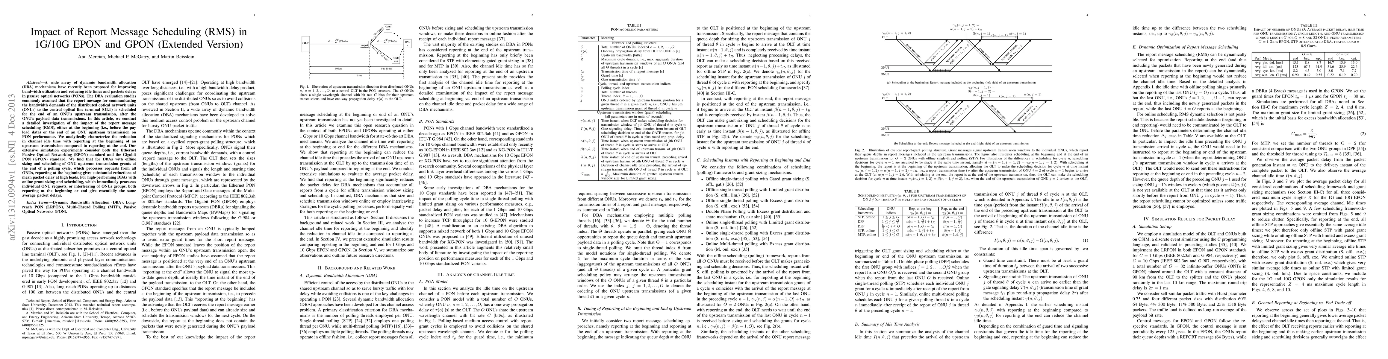 This paper investigates the impact of report message scheduling (RMS) in 1G/10G EPON and GPON networks, finding that RMS at the beginning of an upstream transmission reduces channel idle time and mean packet delay significantly under high load conditions for DBAs with offline sizing. For high-performing DBAs with online grant scheduling, RMS timing (beginning or end) yields similar average packet delays.