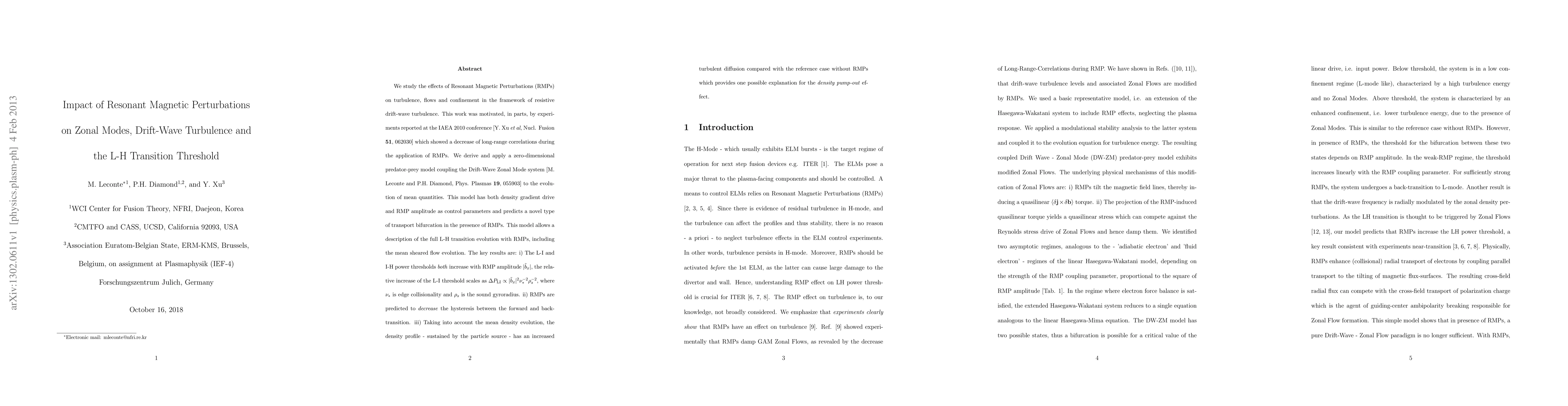 The research investigates the impact of Resonant Magnetic Perturbations (RMPs) on turbulence and confinement in plasma. It introduces a zero-dimensional predator-prey model that predicts RMPs increase L-H transition thresholds and reduce hysteresis, while also enhancing turbulent diffusion leading to density pump-out. This model successfully describes the full L-H transition evolution with RMPs, including mean flow evolution.