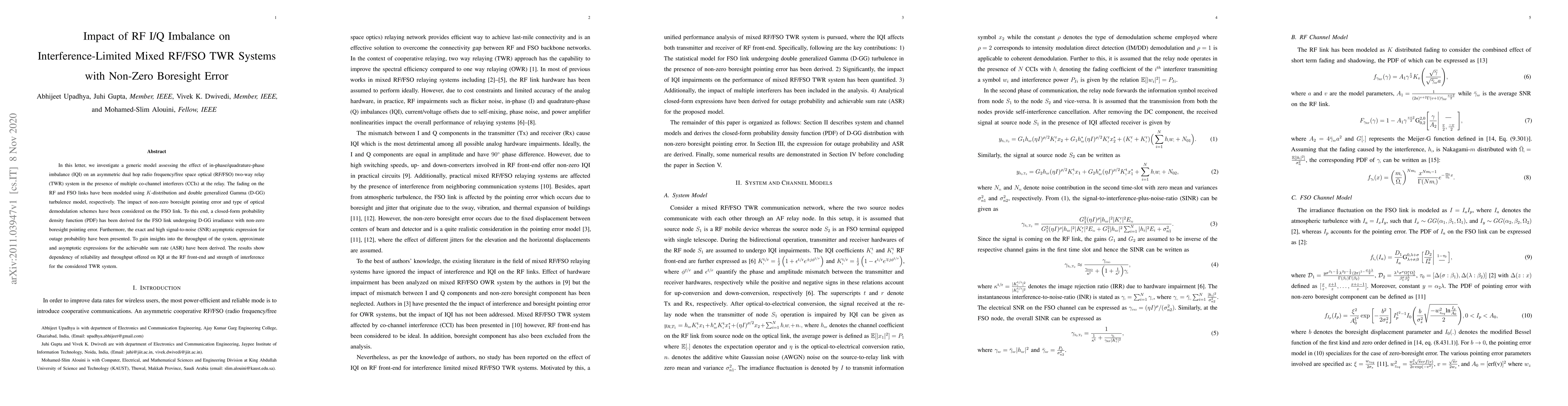 This paper examines the impact of RF I/Q imbalance on interference-limited mixed RF/FSO TWR systems, considering non-zero boresight error and multiple co-channel interferers. It derives closed-form expressions for outage probability and achievable sum rate, revealing the dependency of system reliability and throughput on IQI and interference strength.