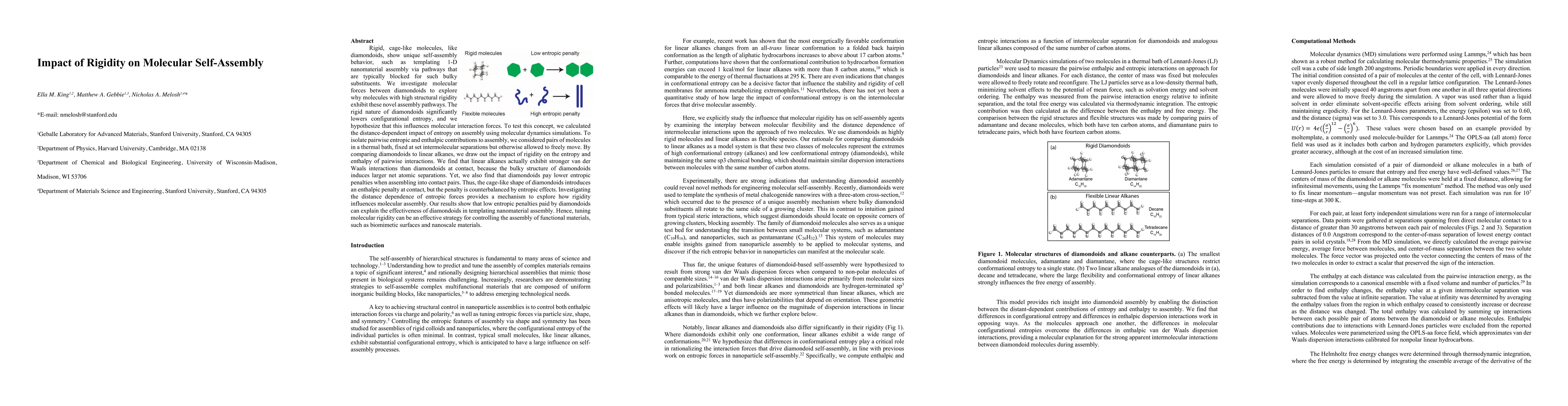 This paper investigates how molecular rigidity, exemplified by diamondoids, influences self-assembly behaviors. It finds that while diamondoids incur enthalpic penalties due to their bulky structure, they experience lower entropic penalties compared to linear alkanes, which allows them to effectively template nanomaterial assembly. The study suggests that molecular rigidity can be tuned to control the assembly of functional materials.