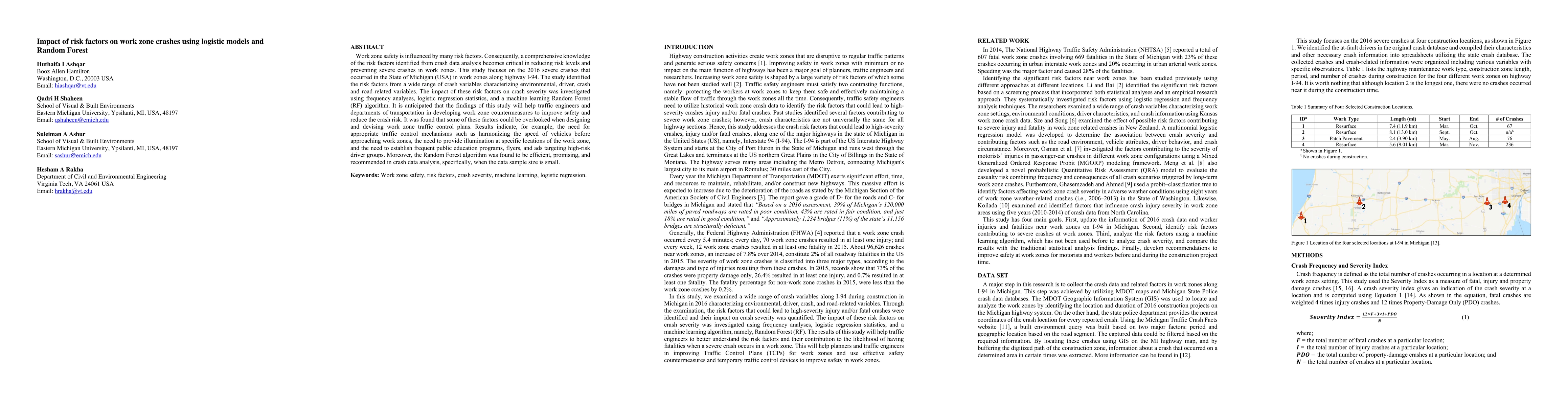Work zone safety is influenced by many risk factors. Consequently, a comprehensive knowledge of the risk factors identified from crash data analysis becomes critical in reducing risk levels and preventing severe crashes in work zones. This study focuses on the 2016 severe crashes that occurred in the State of Michigan (USA) in work zones along highway I-94. The study identified the risk factors from a wide range of crash variables characterizing environmental, driver, crash and road-related variables. The impact of these risk factors on crash severity was investigated using frequency analyses, logistic regression statistics, and a machine learning Random Forest (RF) algorithm. It is anticipated that the findings of this study will help traffic engineers and departments of transportation in developing work zone countermeasures to improve safety and reduce the crash risk. It was found that some of these factors could be overlooked when designing and devising work zone traffic control plans. Results indicate, for example, the need for appropriate traffic control mechanisms such as harmonizing the speed of vehicles before approaching work zones, the need to provide illumination at specific locations of the work zone, and the need to establish frequent public education programs, flyers, and ads targeting high-risk driver groups. Moreover, the Random Forest algorithm was found to be efficient, promising, and recommended in crash data analysis, specifically, when the data sample size is small.
