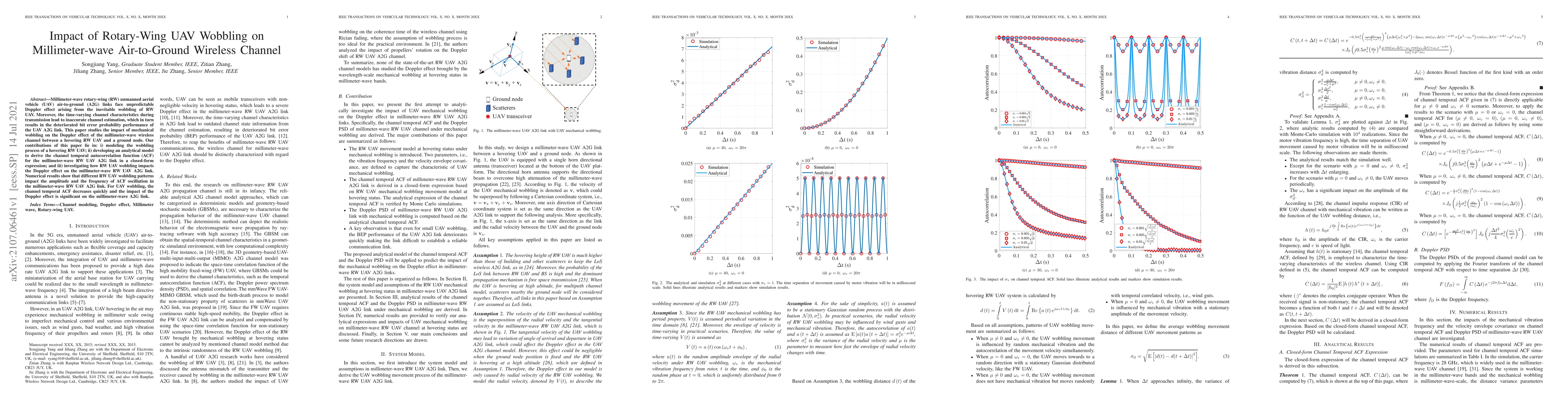 This paper models the wobbling of a rotary-wing UAV and develops an analytical model to study its impact on the Doppler effect in millimeter-wave air-to-ground wireless channels, showing that wobbling affects the channel temporal autocorrelation function and deteriorates bit error probability performance.