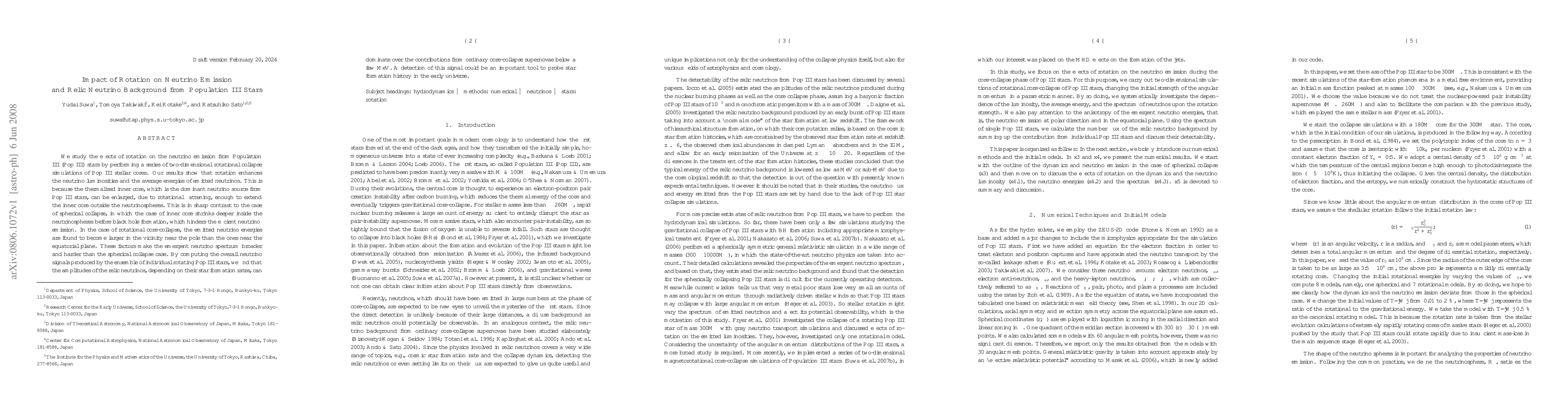 This study investigates how rotation affects neutrino emission from Population III stars, revealing that rotational flattening enlarges the thermalized inner core, enhancing neutrino luminosity and energy. The resulting neutrino spectrum is broader and harder compared to spherical collapse, potentially dominating relic neutrino background signals below a few MeV, offering a probe for early universe star formation history.