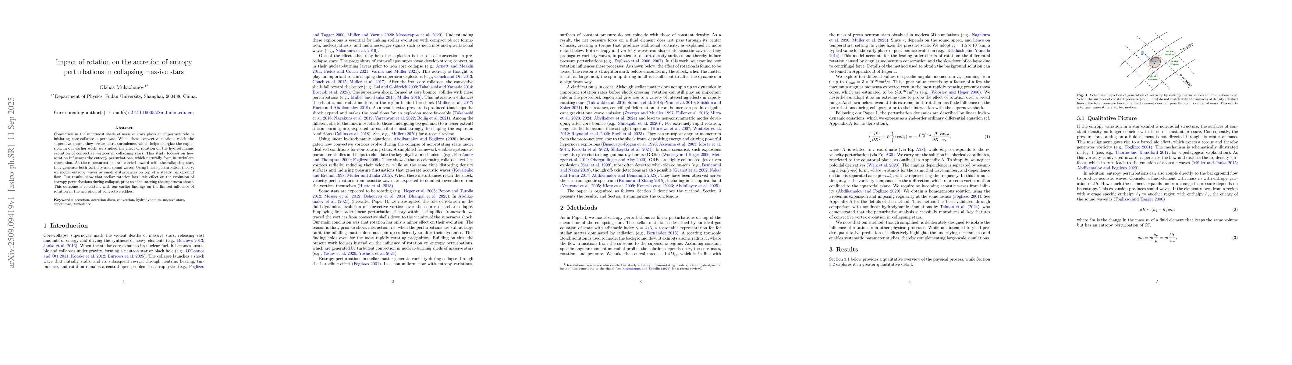 Convection in the innermost shells of massive stars plays an important role in initiating core-collapse supernovae. When these convective motions reach the supernova shock, they create extra turbulence, which helps energize the explosion. In our earlier work, we studied the effect of rotation on the hydrodynamic evolution of convective vortices in collapsing stars. This study focuses on how rotation influences the entropy perturbations, which naturally form in turbulent convection. As these perturbations are carried inward with the collapsing star, they generate both vorticity and sound waves. Using linear perturbation theory, we model entropy waves as small disturbances on top of a steady background flow. Our results show that stellar rotation has little effect on the evolution of entropy perturbations during collapse, prior to encountering the supernova shock. This outcome is consistent with our earlier findings on the limited influence of rotation in the accretion of convective eddies.