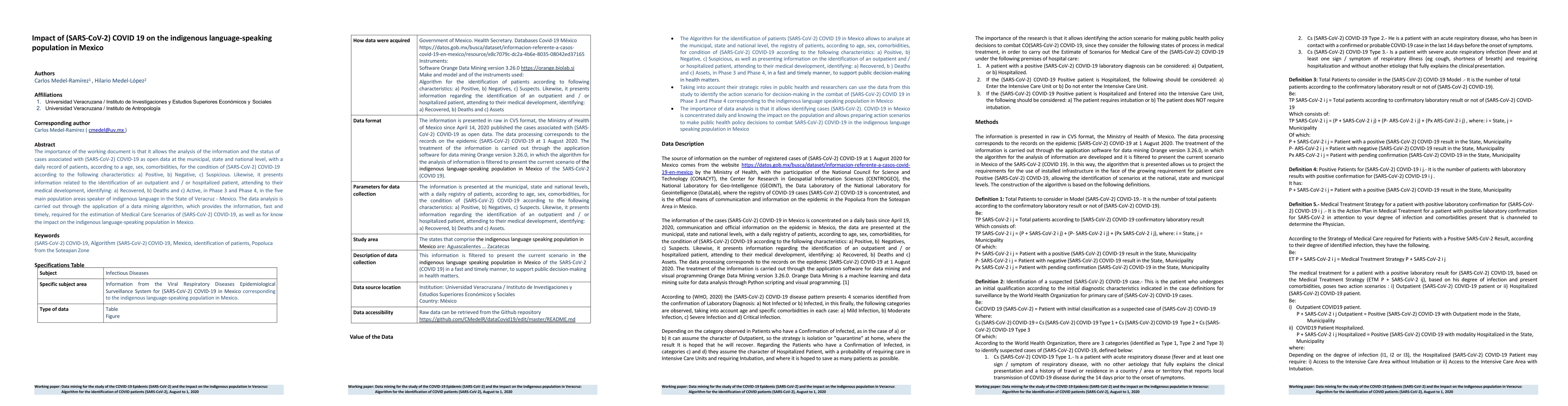 The importance of the working document is that it allows the analysis of the information and the status of cases associated with (SARS-CoV-2) COVID-19 as open data at the municipal, state and national level, with a daily record of patients, according to a age, sex, comorbidities, for the condition of (SARS-CoV-2) COVID-19 according to the following characteristics: a) Positive, b) Negative, c) Suspicious. Likewise, it presents information related to the identification of an outpatient and / or hospitalized patient, attending to their medical development, identifying: a) Recovered, b) Deaths and c) Active, in Phase 3 and Phase 4, in the five main population areas speaker of indigenous language in the State of Veracruz - Mexico. The data analysis is carried out through the application of a data mining algorithm, which provides the information, fast and timely, required for the estimation of Medical Care Scenarios of (SARS-CoV-2) COVID-19, as well as for know the impact on the indigenous language-speaking population in Mexico.