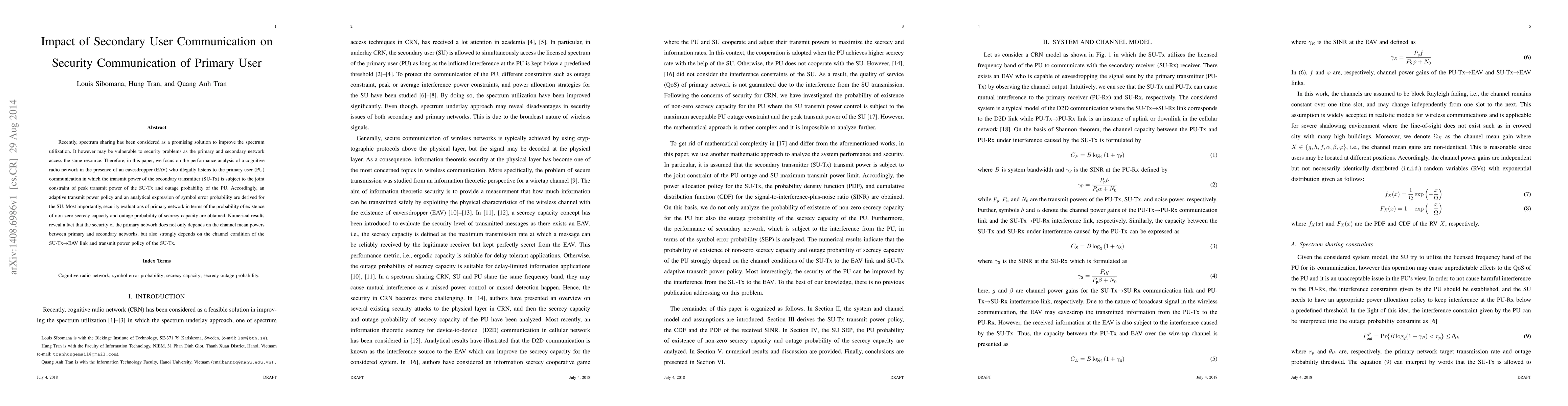 This paper analyzes how secondary user communication affects the security of primary user networks in spectrum sharing systems. It finds that the security depends not only on channel conditions but also on transmit power policies and the presence of an eavesdropper.