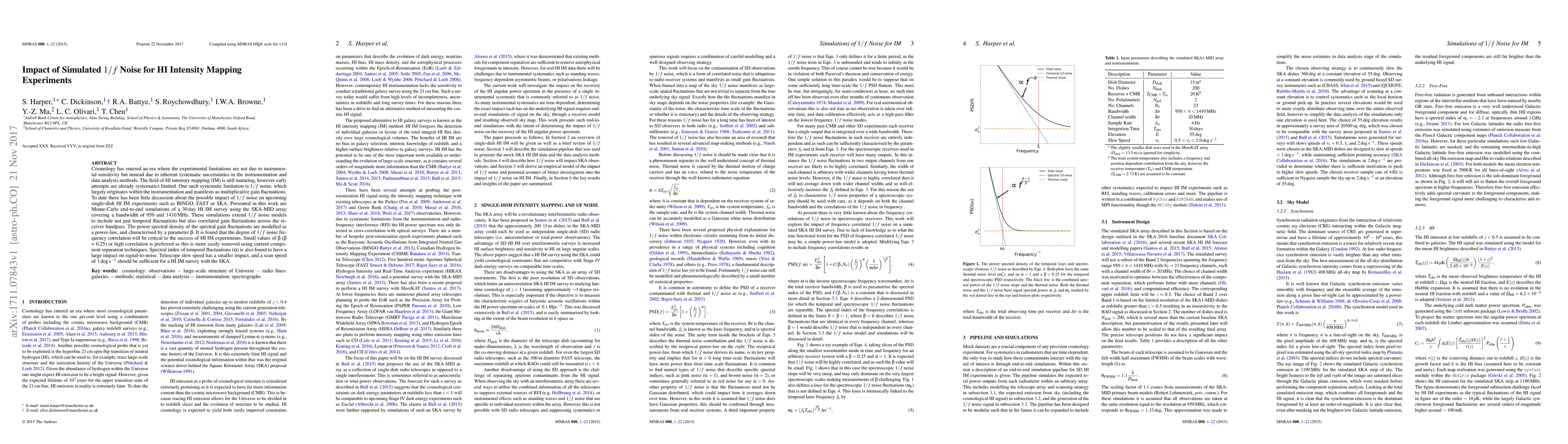 This research uses Monte-Carlo simulations to study the impact of 1/f noise on HI Intensity Mapping (IM) experiments, like those planned for BINGO, FAST, and SKA. It finds that 1/f noise, characterized by a power-law spectral index β, significantly affects IM success; low β values (less than 0.25) or high correlation are preferable as they can be mitigated by current separation techniques. The spectral index of temporal fluctuations (α) and telescope slew speed also influence signal-to-noise, with a scan speed of 1 deg s⁻¹ deemed sufficient for SKA-based HI IM surveys.