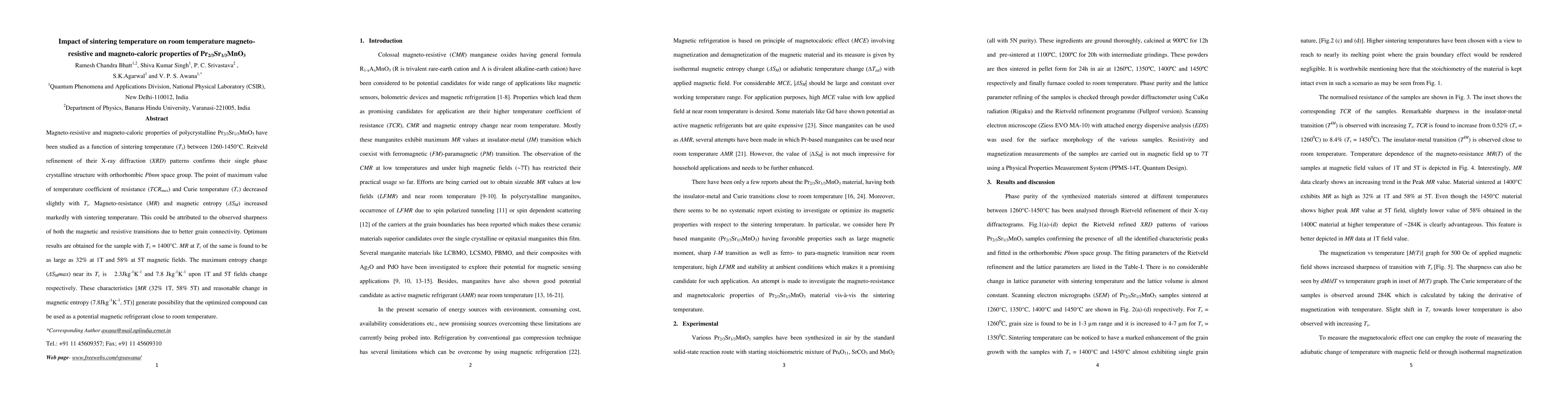 Magneto-resistive and magneto-caloric properties of polycrystalline Pr2/3Sr1/3MnO3 have been studied as a function of sintering temperature (Ts) between 1260-1450{\deg}C. Reitveld refinement of their X-ray diffraction (XRD) patterns confirms their single phase crystalline structure with orthorhombic Pbnm space group. The point of maximum value of temperature coefficient of resistance (TCRmax) and Curie temperature (Tc) decreased slightly with Ts. Magneto-resistance (MR) and magnetic entropy ({\Delta}SM) increased markedly with sintering temperature. This could be attributed to the observed sharpness of both the magnetic and resistive transitions due to better grain connectivity. Optimum results are obtained for the sample with Ts = 1400{\deg}C. MR at Tc of the same is found to be as large as 32% at 1T and 58% at 5T magnetic fields. The maximum entropy change ({\Delta}SMmax) near its Tc is 2.3Jkg-1K-1 and 7.8 Jkg-1K-1 upon 1T and 5T fields change respectively. These characteristics [MR (32% 1T, 58% 5T) and reasonable change in magnetic entropy (7.8Jkg-1K-1, 5T)] generate possibility that the optimized compound can be used as a potential magnetic refrigerant close to room temperature.