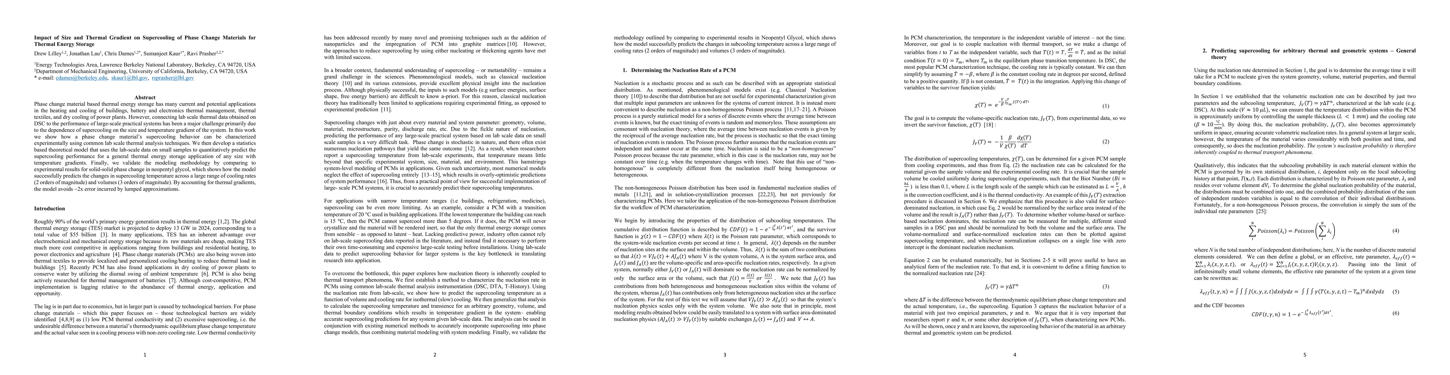 This paper investigates the impact of size and thermal gradient on the supercooling behavior of phase change materials used in thermal energy storage. It develops a theoretical model to predict supercooling performance based on lab-scale thermal data, validated by experiments on neopentyl glycol, demonstrating accurate predictions across varying cooling rates and volumes.