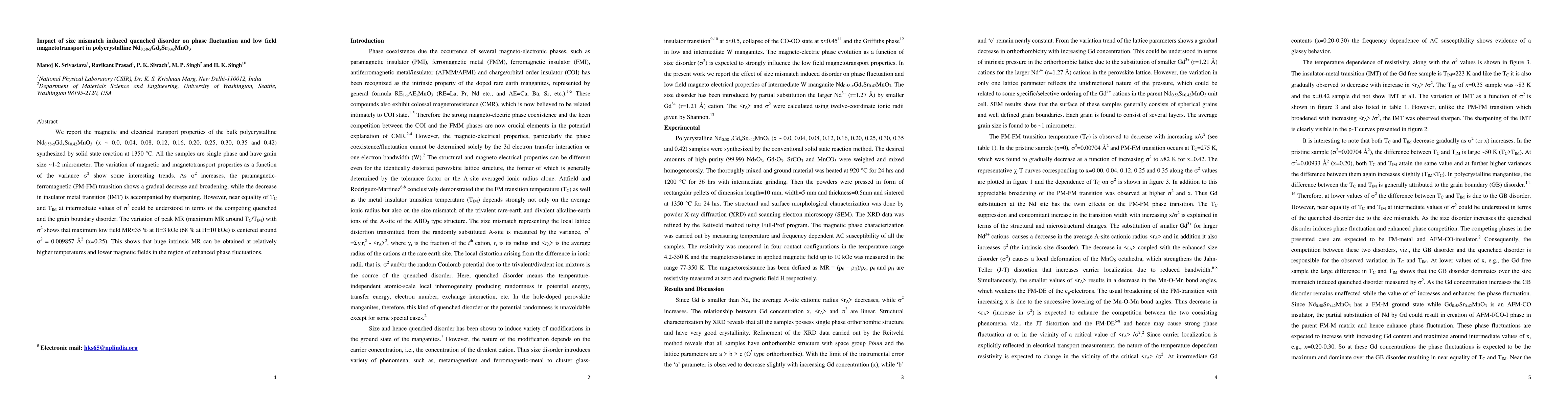 We report the magnetic and electrical transport properties of the bulk polycrystalline NGSMO (x ~ 0.0, 0.04, 0.08, 0.12, 0.16, 0.20, 0.25, 0.30, 0.35 and 0.42) synthesized by solid state reaction at 1350 degree Celsius. All the samples are single phase and have grain size ~1-2 micrometer. The variation of magnetic and magnetotransport properties as a function of the variance sigma^2 show some interesting trends. As sigma^2 increases, the paramagnetic-ferromagnetic (PM-FM) transition shows a gradual decrease and broadening, while the decrease in insulator metal transition (IMT) is accompanied by sharpening. However, near equality of TC and TIM at intermediate values of sigma2 could be understood in terms of the competing quenched and the grain boundary disorder. The variation of peak MR (maximum MR around TC/TIM) with sigma2 shows that maximum low field MR =35 % at H=3 kOe (68 % at H=10 kOe) is centered around sigma2 = 0.009857 {A}2 (x=0.25). This shows that huge intrinsic MR can be obtained at relatively higher temperatures and lower magnetic fields in the region of enhanced phase fluctuations.