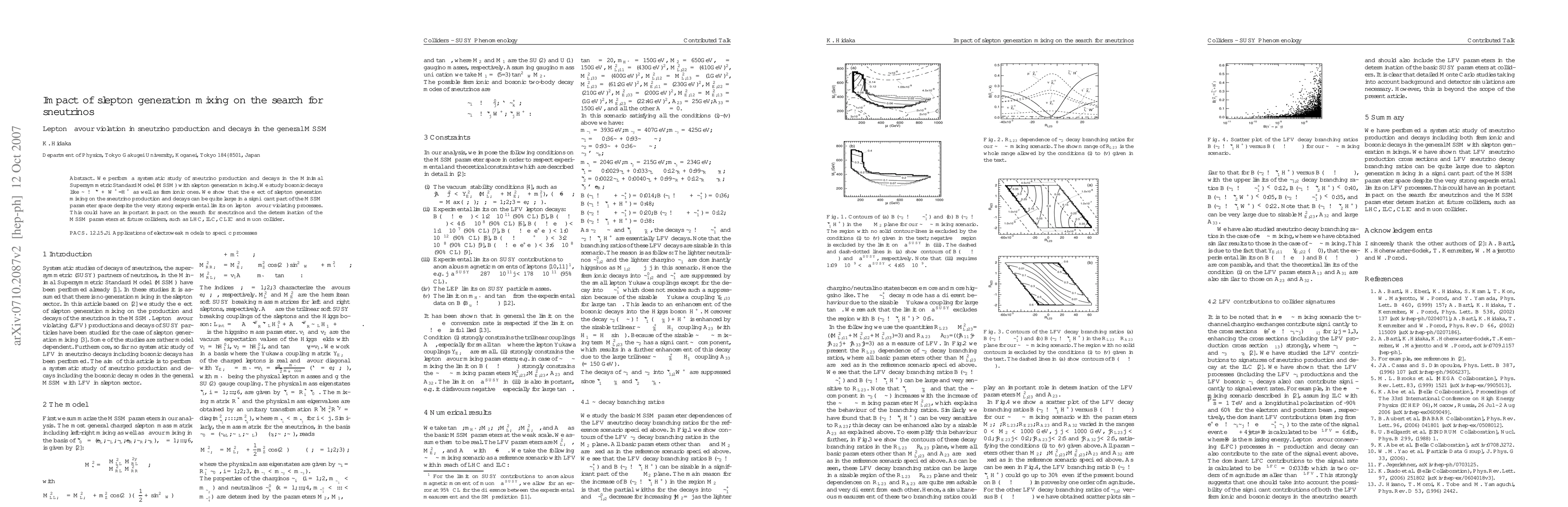 We perform a systematic study of sneutrino production and decays in the Minimal Supersymmetric Standard Model (MSSM) with slepton generation mixing. We study bosonic decays like sneutrino \to slepton^- + W^+/H^+ as well as fermionic ones. We show that the effect of slepton generation mixing on the sneutrino production and decays can be quite large in a significant part of the MSSM parameter space despite the very strong experimental limits on lepton flavour violating processes. This could have an important impact on the search for sneutrinos and the determination of the MSSM parameters at future colliders, such as LHC, ILC, CLIC and muon collider.