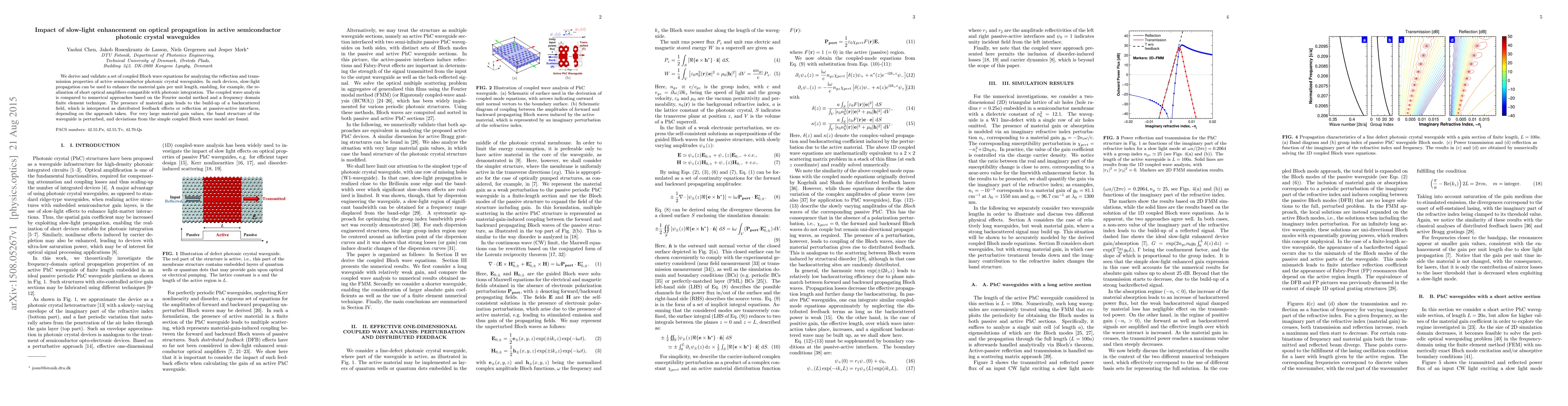 This paper derives coupled Bloch wave equations to analyze the optical propagation in active semiconductor photonic crystal waveguides, demonstrating how slow-light enhancement can boost material gain, facilitating the design of compact optical amplifiers. The analysis is validated against numerical methods, revealing distributed feedback effects and perturbations in the waveguide's band structure at high material gain levels.