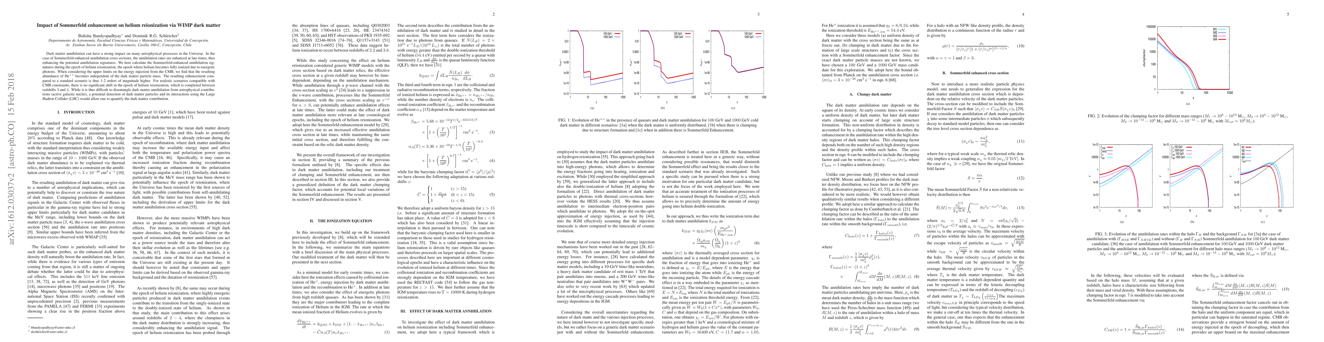 Dark matter annihilation can have a strong impact on many astrophysical processes in the Universe. In the case of Sommerfeld-enhanced annihilation cross sections, the annihilation rates are enhanced at late times, thus enhancing the potential annihilation signatures. We here calculate the Sommerfeld-enhanced annihilation signatures during the epoch of helium reionization, the epoch where helium becomes fully ionized due to energetic photons. When considering the upper limits on the energy injection from the CMB, we find that the resulting abundance of He$^{++}$ becomes independent of the dark matter particle mass. The resulting enhancement compared to a standard scenario is thus 1-2 orders of magnitude higher. For realistic scenarios compatible with CMB constraints, there is no significant shift in the epoch of helium reionization, which is completed between redshifts $3$ and $4$. While it is thus difficult to disentangle dark matter annihilation from astrophysical contributions (active galactic nuclei), a potential detection of dark matter particles and its interactions using the Large Hadron Collider (LHC) would allow one to quantify the dark matter contribution.
