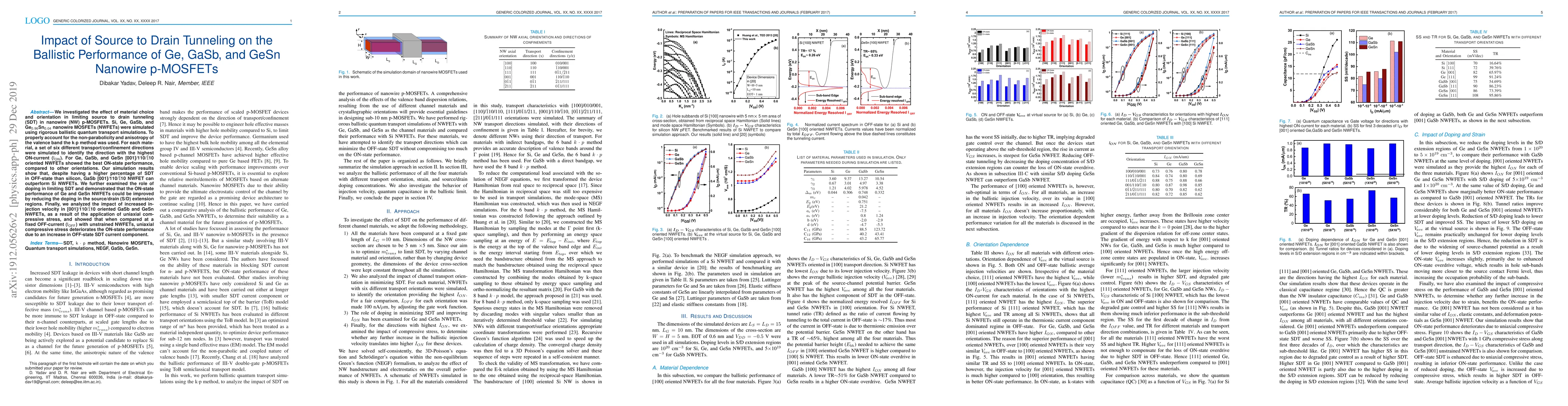 This study investigates the impact of source to drain tunneling (SDT) in nanowire p-MOSFETs made from Si, Ge, GaSb, and GeSn, finding that [001]/110/-110 oriented NWFETs exhibit the best ON-state performance. Despite higher SDT in the OFF-state, GaSb NWFETs can outperform Si NWFETs, and doping reduction in Ge and GeSn NWFETs can improve ON-state performance.