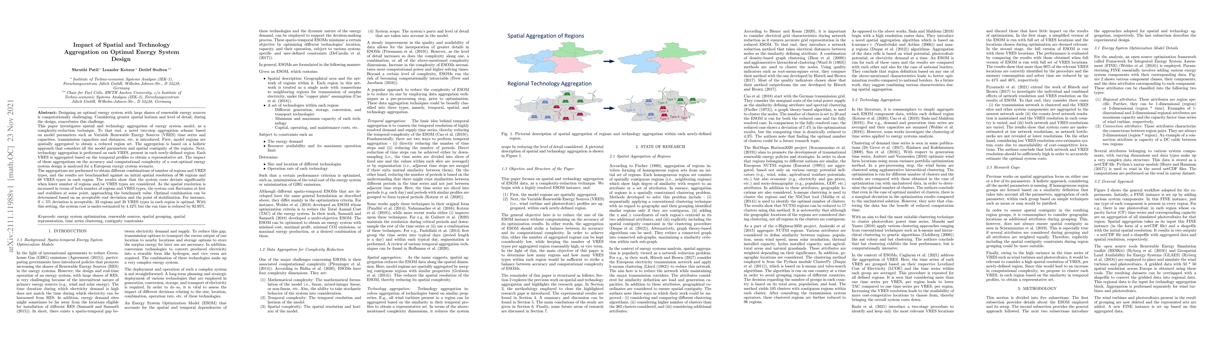 Designing an optimal energy system with large shares of renewable energy sources is computationally challenging. Considering greater spatial horizon and level of detail, during the design, exacerbates this challenge. This paper investigates spatial and technology aggregation of energy system model, as a complexity-reduction technique. To that end, a novel two-step aggregation scheme based on model parameters such as Variable Renewable Energy Sources (VRES) time series and capacities, transmission capacities and distances, etc, is introduced. First, model regions are aggregated to obtain reduced region set. The aggregation is based on a holistic approach that considers all model parameters and spatial contiguity of regions. Next, technology aggregation is performed on each VRES, present in each newly-defined region. Each VRES is aggregated based on the temporal profiles to obtain a representative set. The impact of these aggregations on accuracy and computational complexity of a cost-optimal energy system design is analyzed for a European energy system scenario.The aggregations are performed to obtain different combinations of number of regions and VRES types, and the results are benchmarked against initial spatial resolution of 96 regions and 68 VRES types in each region. The results show that the system costs deviate significantly when lower number of regions and/or VRES types are considered. As the spatial resolution is increased in terms of both number of regions and VRES types, the system cost fluctuates at first and stabilizes at some point, approaching the benchmark value. Optimal combination can be determined based on an acceptable cost deviation and the point of stabilization. For instance, if <5% deviation is acceptable, 33 regions and 38 VRES types in each region is optimal. With this setting, the system cost is under-estimated by 4.42% but the run time is reduced by 92.95%.