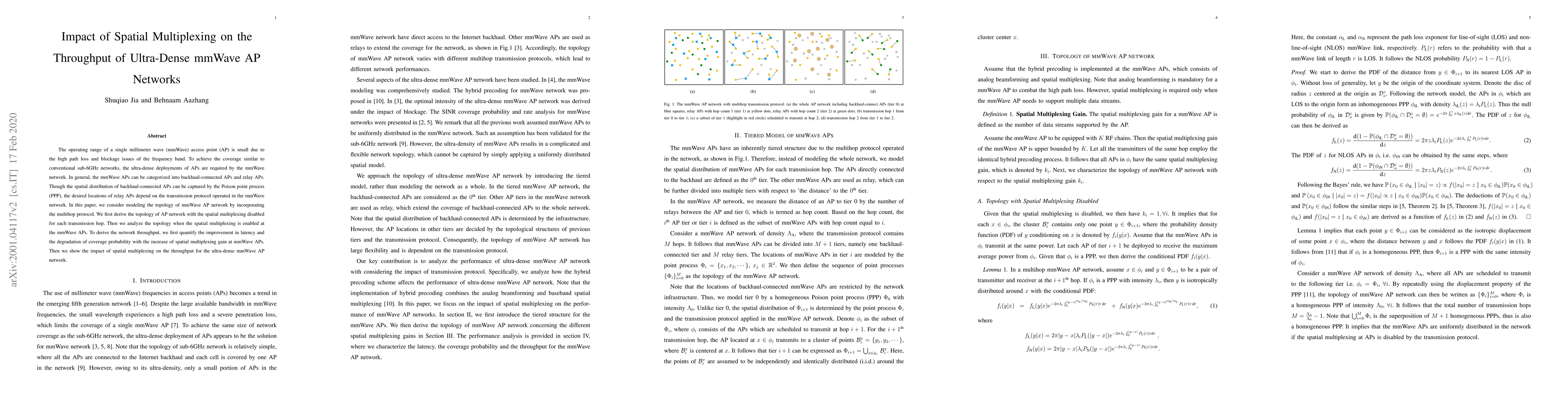 This paper investigates the impact of spatial multiplexing on the throughput of ultra-dense millimeter wave (mmWave) access point (AP) networks. It models the network topology with both spatial multiplexing disabled and enabled, analyzing the resulting throughput improvements and coverage degradation.