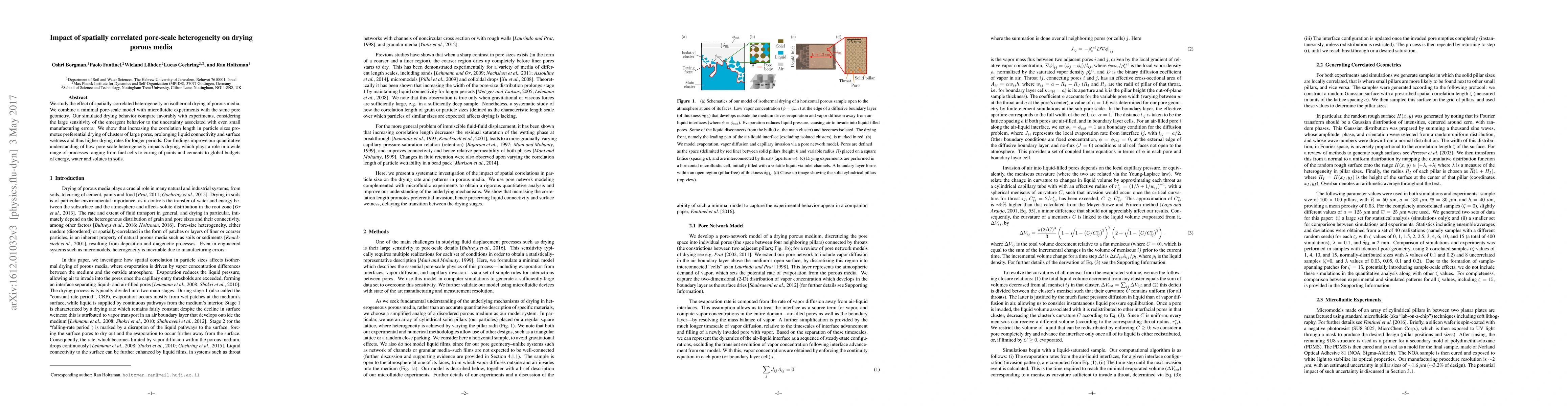 This study investigates the influence of spatially correlated pore-scale heterogeneity on the drying behavior of porous media, demonstrating that increased correlation length in particle sizes promotes preferential drying of large pore clusters, prolonging liquid connectivity and enhancing drying rates. The findings enhance the understanding of drying processes in various applications, from fuel cells to soil management.