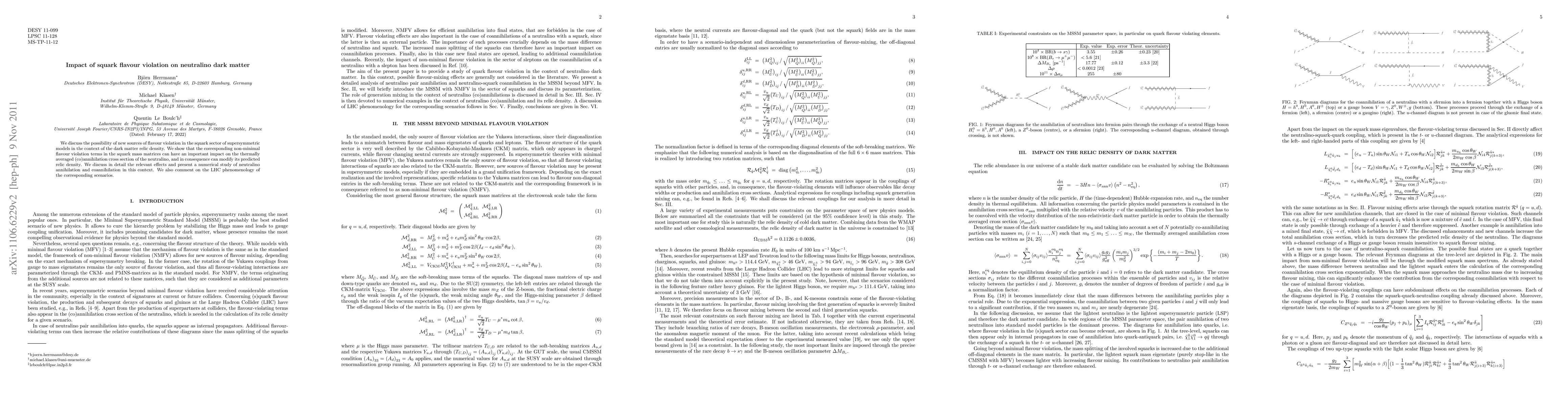 This paper explores how flavour violation in the squark sector of supersymmetric models affects neutralino dark matter relic density. It finds that non-minimal flavour violation terms can significantly alter neutralino annihilation and coannihilation processes, thereby modifying the predicted dark matter abundance.