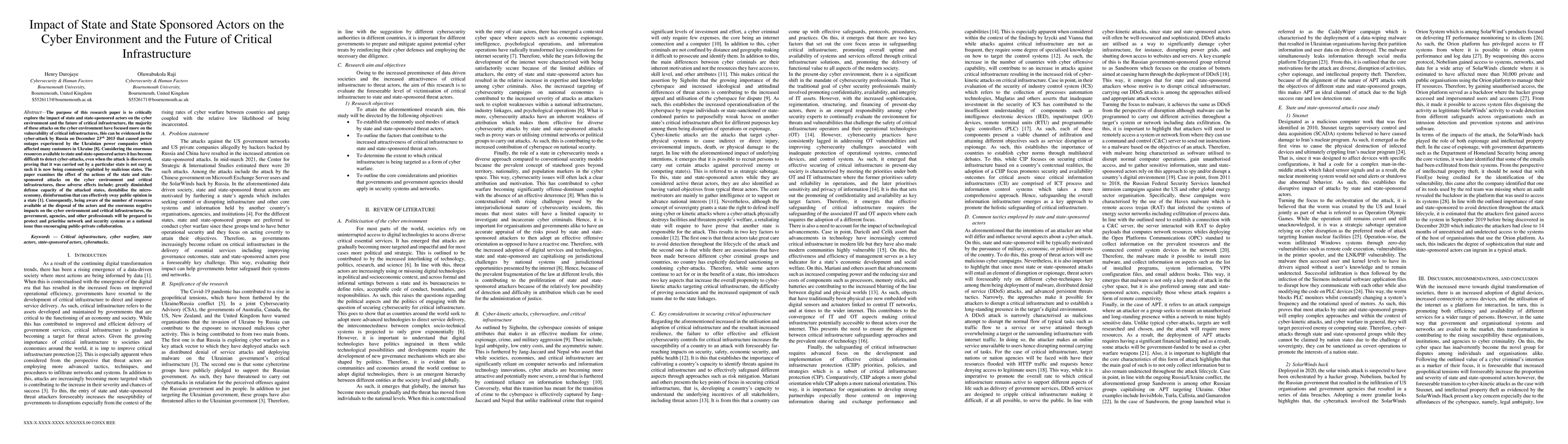 The purpose of this research paper is to critically explore the impact of state and state-sponsored actors on the cyber environment and the future of critical infrastructure, the majority of these attacks on the cyber environment have focused more on the vulnerability of critical infrastructures, this can be evidenced in the cyber-attack by Russia on December 23rd, 2015 that caused power outages experienced by the Ukrainian power companies which affected many customers in Ukraine [8]. Considering the enormous resources available to state and state-sponsored actors it has become difficult to detect cyber-attacks, even when the attack is discovered, proving that it was carried out by a particular state is not easy as such it is now being commonly exploited by malicious states. The paper examines the effect of the actions of the state and state-sponsored attacks on the cyber environment and critical infrastructures, these adverse effects include; greatly diminished defense capacity of the attacked states, destabilise the micro-economy, disinformation that can effectively sway public opinion in a state [1]. Consequently, being aware of the number of resources available at the disposal of the actors and the enormous negative impacts on the cyber environment and critical infrastructures, the government, agencies, and other professionals will be prepared to protect and prioritise network and security systems as a national issue thus encouraging public-private collaboration.