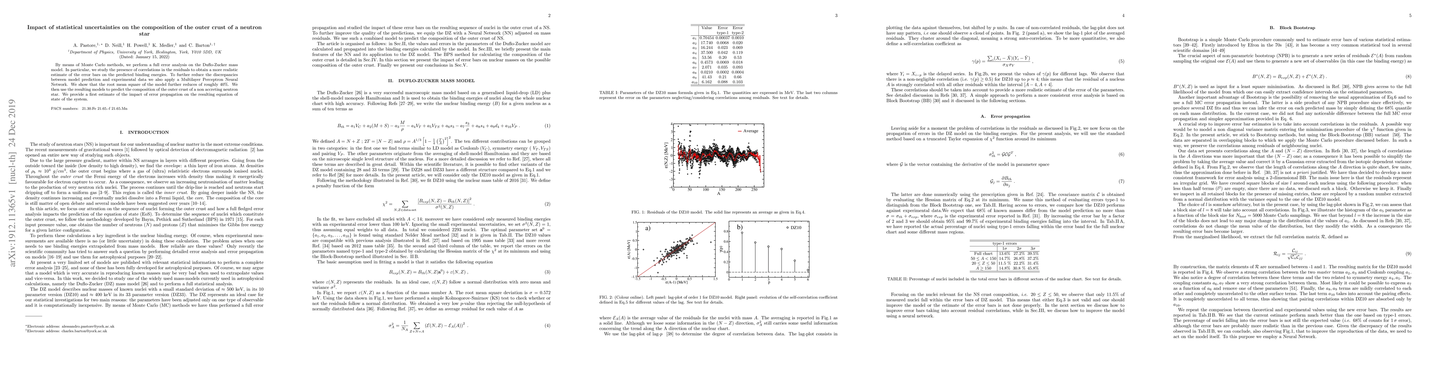 By means of Monte Carlo methods, we perform a full error analysis on the Duflo-Zucker mass model. In particular, we study the presence of correlations in the residuals to obtain a more realistic estimate of the error bars on the predicted binding energies. To further reduce the discrepancies between model prediction and experimental data we also apply a Multilayer Perceptron Neural Network. We show that the root mean square of the model further reduces of roughly 40\%. We then use the resulting models to predict the composition of the outer crust of a non accreting neutron star. We provide a first estimate of the impact of error propagation on the resulting equation of state of the system.