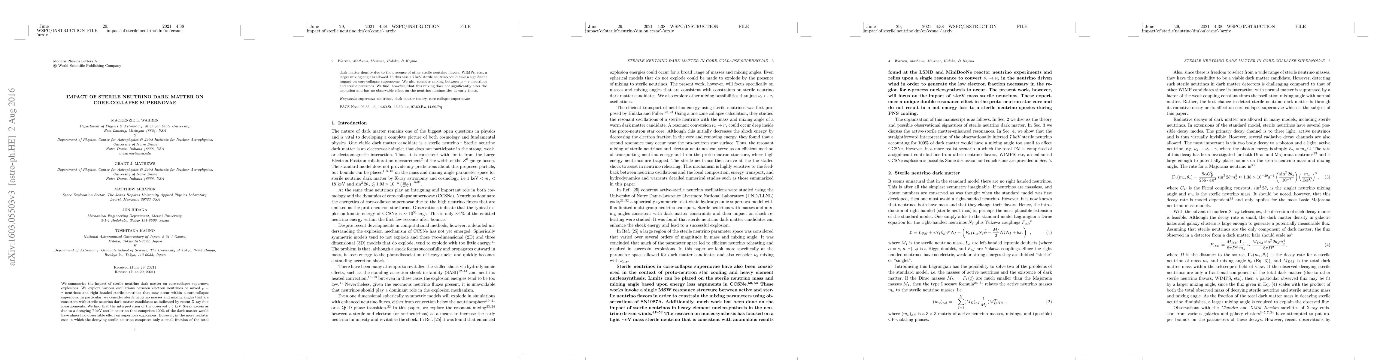 We summarize the impact of sterile neutrino dark matter on core-collapse supernova explosions. We explore various oscillations between electron neutrinos or mixed $\mu-\tau$ neutrinos and right-handed sterile neutrinos that may occur within a core-collapse supernova. In particular, we consider sterile neutrino masses and mixing angles that are consistent with sterile neutrino dark matter candidates as indicated by recent X-ray flux measurements. We find that the interpretation of the observed 3.5 keV X-ray excess as due to a decaying 7 keV sterile neutrino that comprises 100\% of the dark matter would have almost no observable effect on supernova explosions. However, in the more realistic case in which the decaying sterile neutrino comprises only a small fraction of the total dark matter density due to the presence of other sterile neutrino flavors, WIMPs, etc., a larger mixing angle is allowed. In this case a 7 keV sterile neutrino could have a significant impact on core-collapse supernovae. We also consider mixing between $\mu-\tau$ neutrinos and sterile neutrinos. We find, however, that this mixing does not significantly alter the explosion and has no observable effect on the neutrino luminosities at early times.