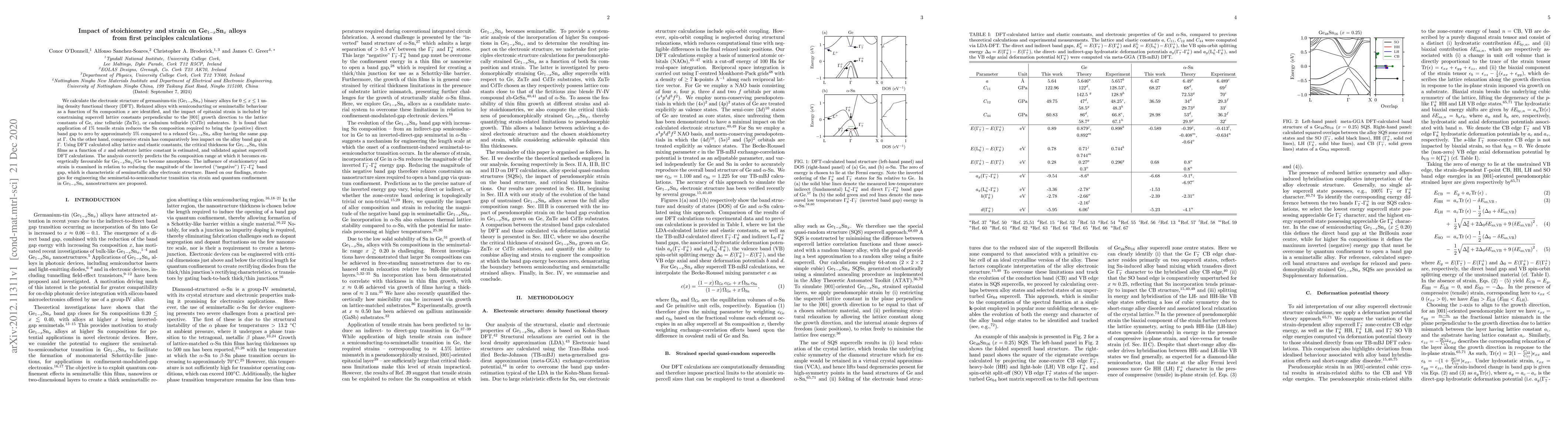 This study uses density functional theory to investigate the electronic structure of Ge$_{1-x}$Sn$_{x}$ alloys, identifying how stoichiometry and epitaxial strain influence their band gap and semiconducting/semimetallic behavior. Strain-induced modifications to the alloy's band gap and critical thickness for thin films are analyzed, leading to proposals for engineering the transition from semimetal to semiconductor via strain and quantum confinement.
