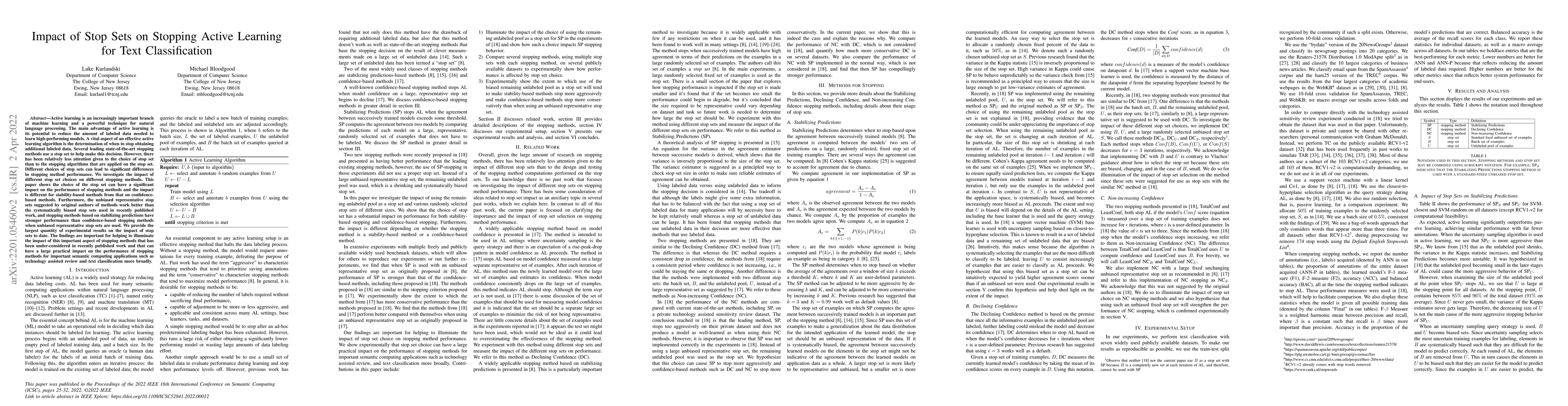 This paper investigates how different stop set choices affect the performance of various stopping methods in active learning for text classification. It finds that unbiased representative stop sets outperform biased ones, and that stability-based methods perform better than confidence-based methods when using unbiased stop sets, highlighting the significant impact of stop set selection on stopping method efficacy.