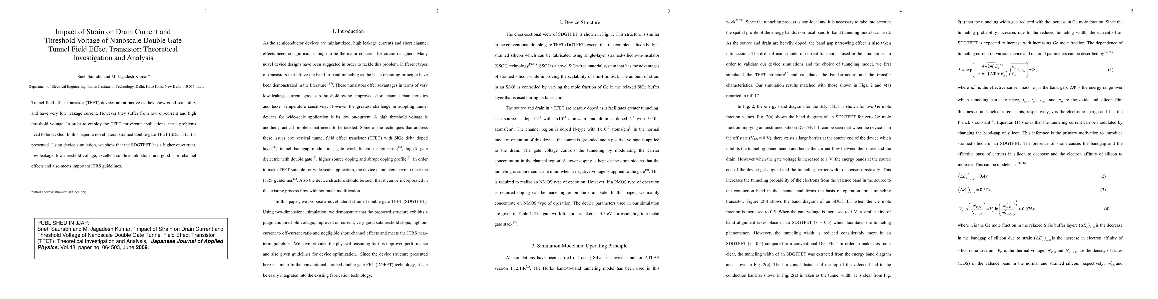 This paper investigates a novel lateral strained double-gate TFET (SDGTFET) that addresses low on-current and high threshold voltage issues. Device simulations reveal that the SDGTFET achieves higher on-current, low leakage, low threshold voltage, and adheres to ITRS guidelines.