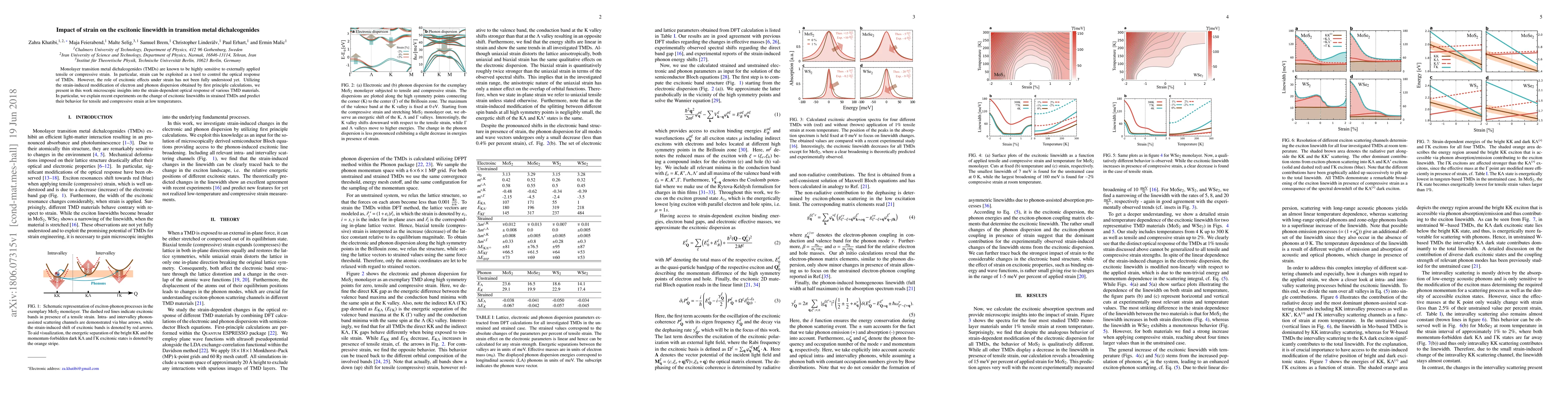This study investigates how strain affects the excitonic linewidth in monolayer transition metal dichalcogenides (TMDs), using first-principles calculations to analyze electron and phonon dispersion changes. It provides insights into the optical response modulation by strain and predicts excitonic linewidth behavior under tensile and compressive strain at low temperatures.