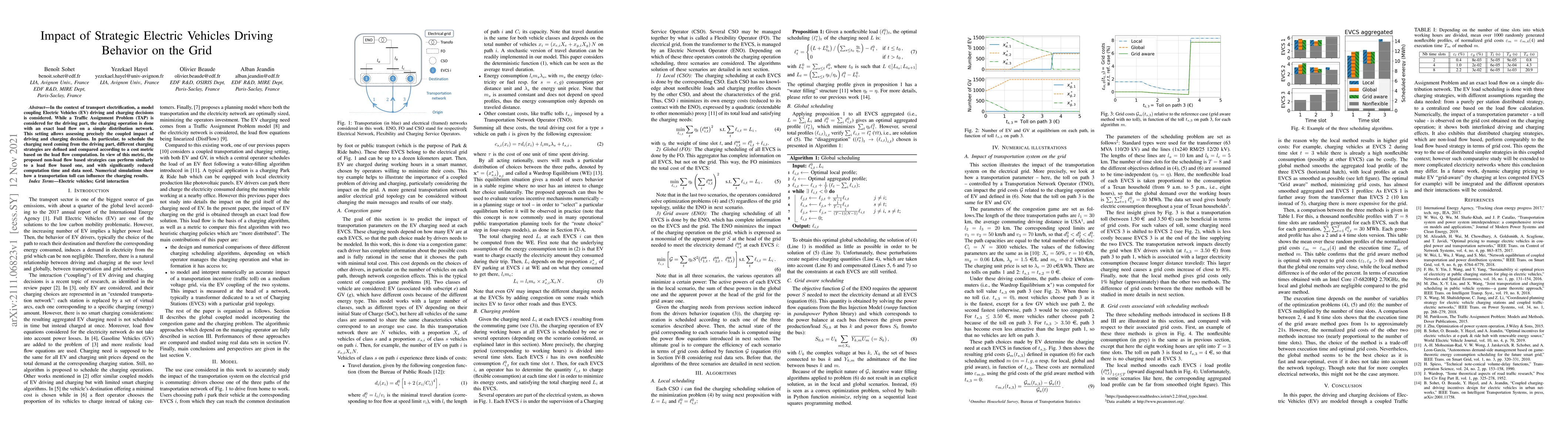 In the context of transport electrification, a model coupling Electric Vehicles (EV) driving and charging decisions is considered. While a Traffic Assignment Problem (TAP) is considered for the driving part, the charging operation is done with an exact load flow on a simple distribution network. This setting allows assessing precisely the coupled impact of driving and charging decisions. In particular, to schedule the charging need coming from the driving part, different charging strategies are defined and compared according to a cost metric based on the load flow computation. In view of this metric, the proposed non-load flow based strategies can perform similarly to a load flow based one, and with significantly reduced computation time and data need. Numerical simulations show how a transportation toll can influence the charging results.