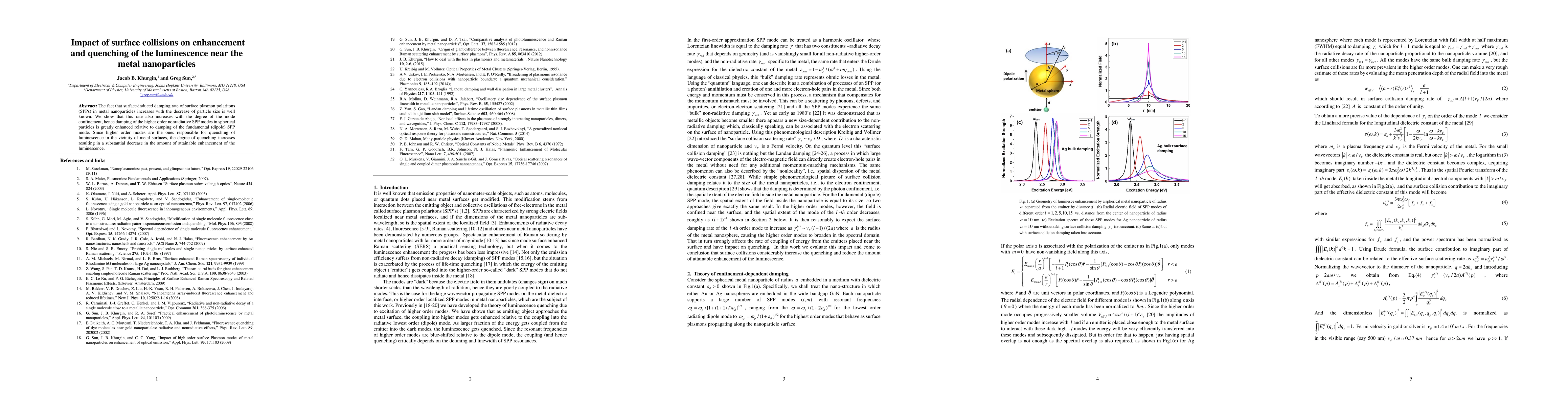 This paper investigates how surface collisions affect luminescence near metal nanoparticles, demonstrating that smaller particles and higher mode confinement increase the damping of higher-order nonradiative surface plasmon polaritons, leading to greater quenching of luminescence and reduced enhancement potential.