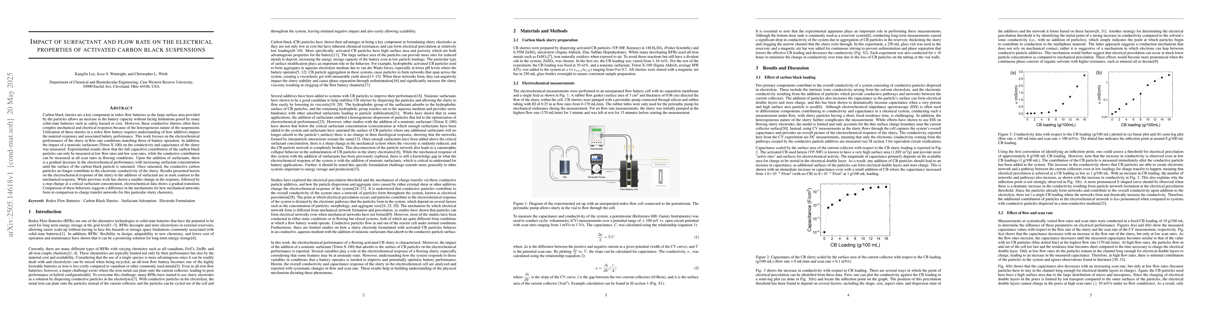 This research investigates the effect of surfactant (Triton X-100) and flow rate on the electrical properties of carbon black suspensions used in redox flow batteries. Findings indicate that at low flow rates and scan rates, full capacitive contribution of carbon black particles can be measured; surfactant addition gradually decreases electrochemical performance until the surface saturation point, beyond which carbon particles no longer contribute to electronic conductivity. This contrasts with mechanical response observed in prior studies, suggesting different formation mechanisms for mechanical and charge transfer networks in these slurries.