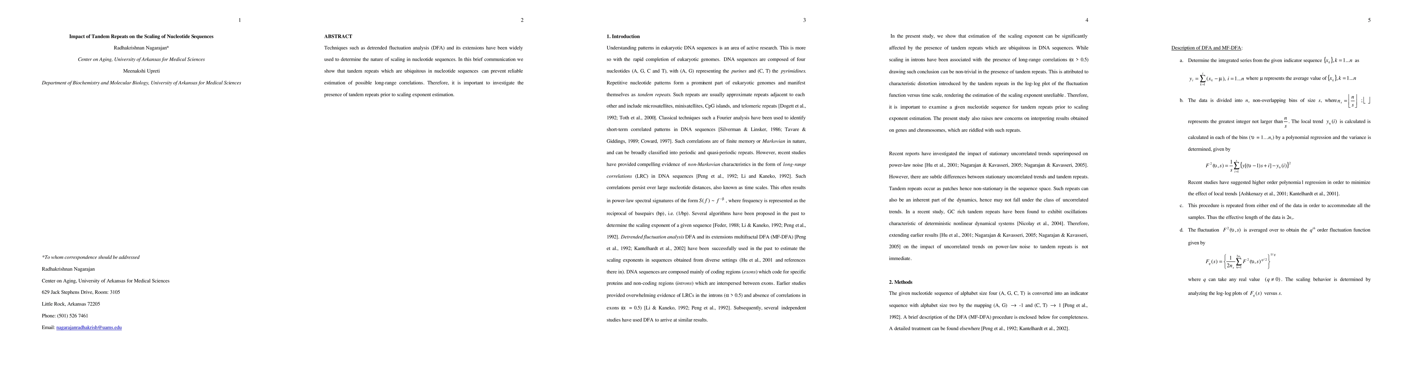 The paper employs a methodological approach involving the examination of tandem repeats in nucleotide sequences, utilizing techniques like detrended fluctuation analysis (DFA) and its extensions to study scaling properties.