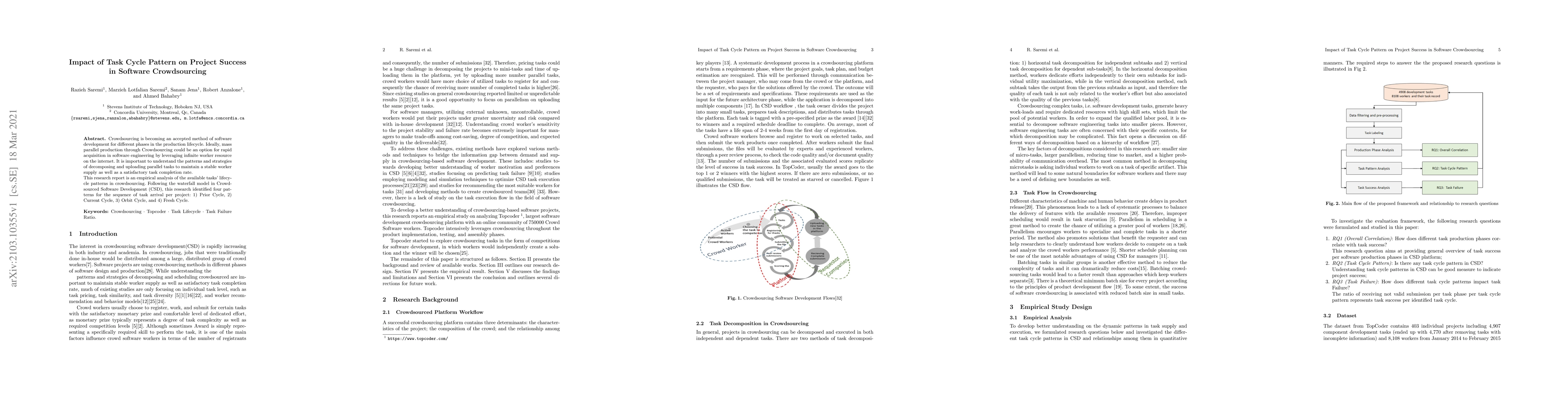 This research investigates the impact of different task cycle patterns on project success in crowdsourcing software development. It identifies four task arrival patterns—Prior Cycle, Current Cycle, Orbit Cycle, and Fresh Cycle—and analyzes their effectiveness in maintaining worker supply and task completion rates.