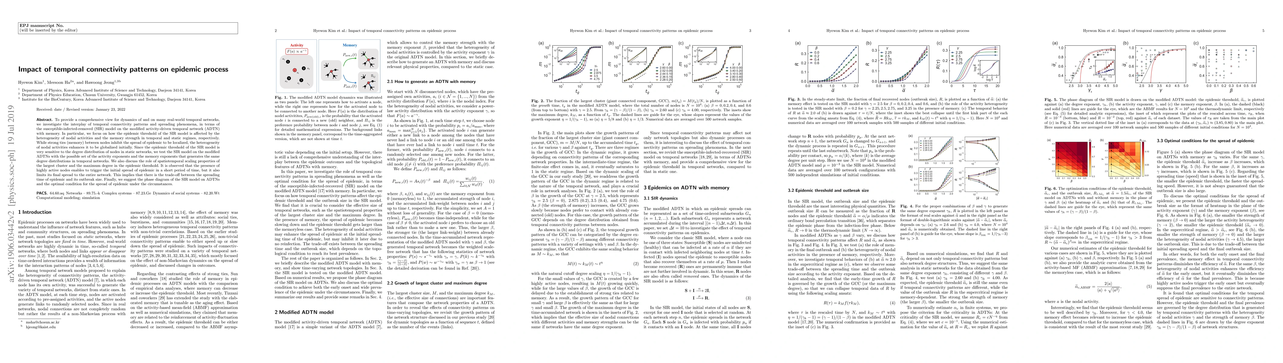 To provide a comprehensive view for dynamics of and on many real-world temporal networks, we investigate the interplay of temporal connectivity patterns and spreading phenomena, in terms of the susceptible-infected-removed (SIR) model on the modified activity-driven temporal network (ADTN) with memory. In particular, we focus on how the epidemic threshold of the SIR model is affected by the heterogeneity of nodal activities and the memory strength in temporal and static regimes, respectively. While strong ties (memory) between nodes inhibit the spread of epidemic to be localized, the heterogeneity of nodal activities enhances it to be globalized initially. Since the epidemic threshold of the SIR model is very sensitive to the degree distribution of nodes in static networks, we test the SIR model on the modified ADTNs with the possible set of the activity exponents and the memory exponents that generates the same degree distributions in temporal networks. We also discuss the role of spatiotemporal scaling properties of the largest cluster and the maximum degree in the epidemic threshold. It is observed that the presence of highly active nodes enables to trigger the initial spread of epidemic in a short period of time, but it also limits its final spread to the entire network. This implies that there is the trade-off between the spreading time of epidemic and its outbreak size. Finally, we suggest the phase diagram of the SIR model on ADTNs and the optimal condition for the spread of epidemic under the circumstances.